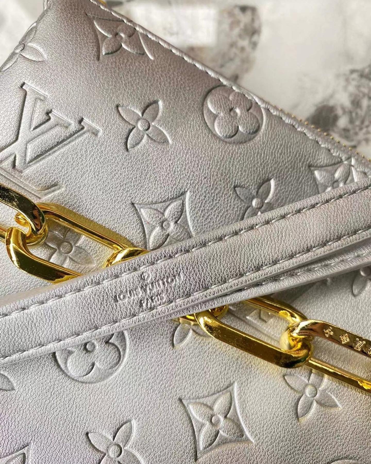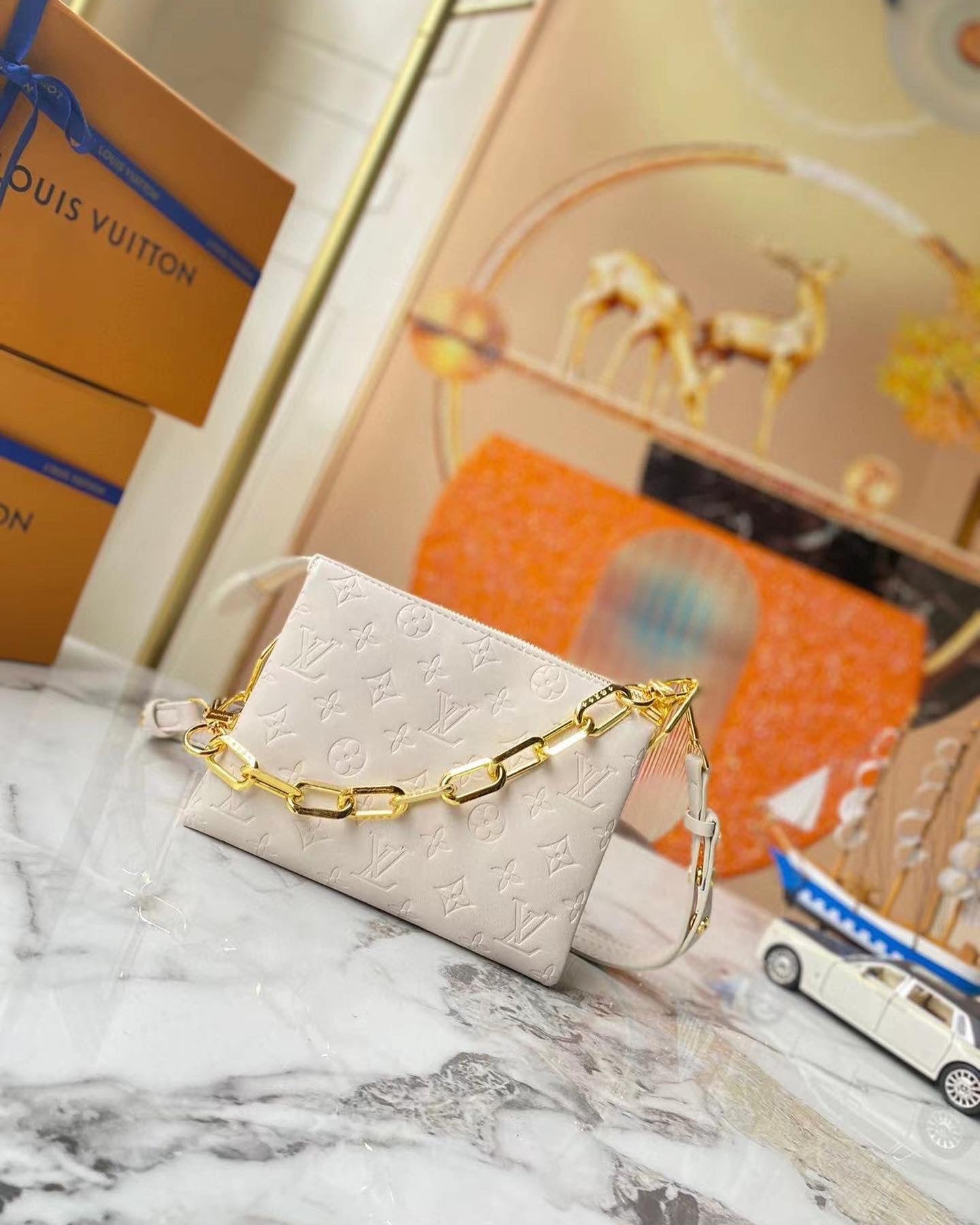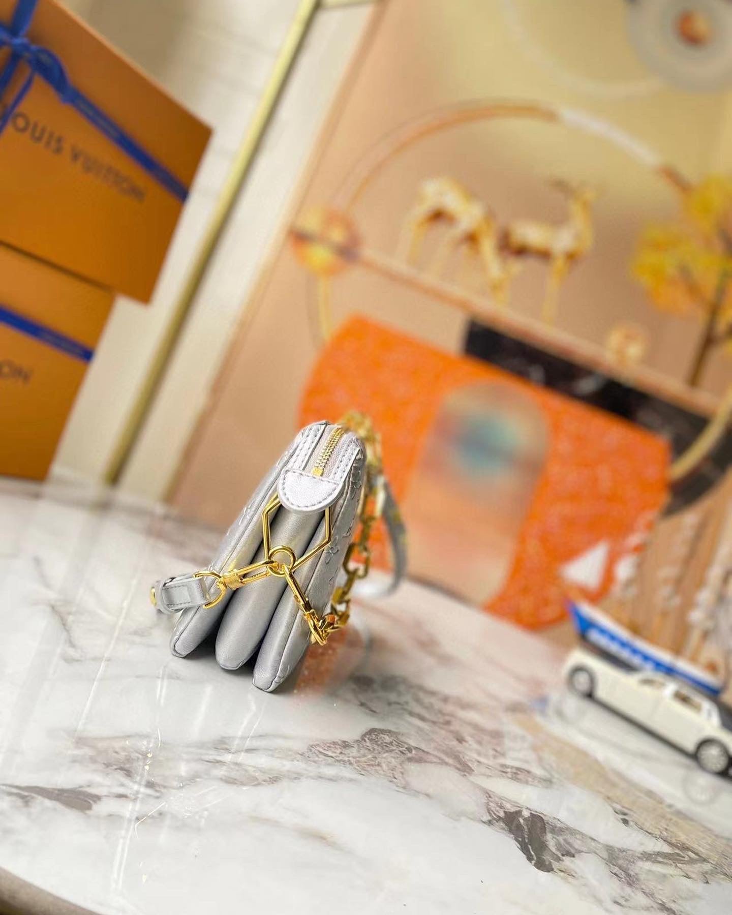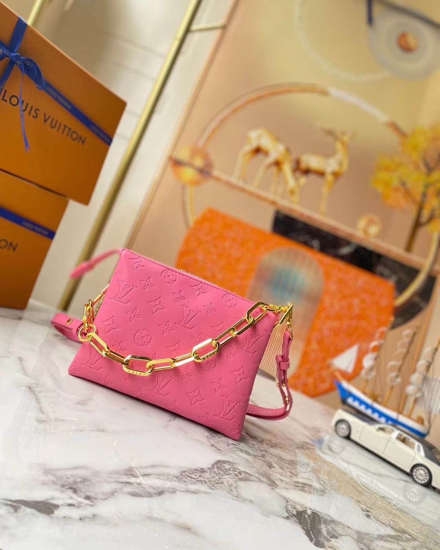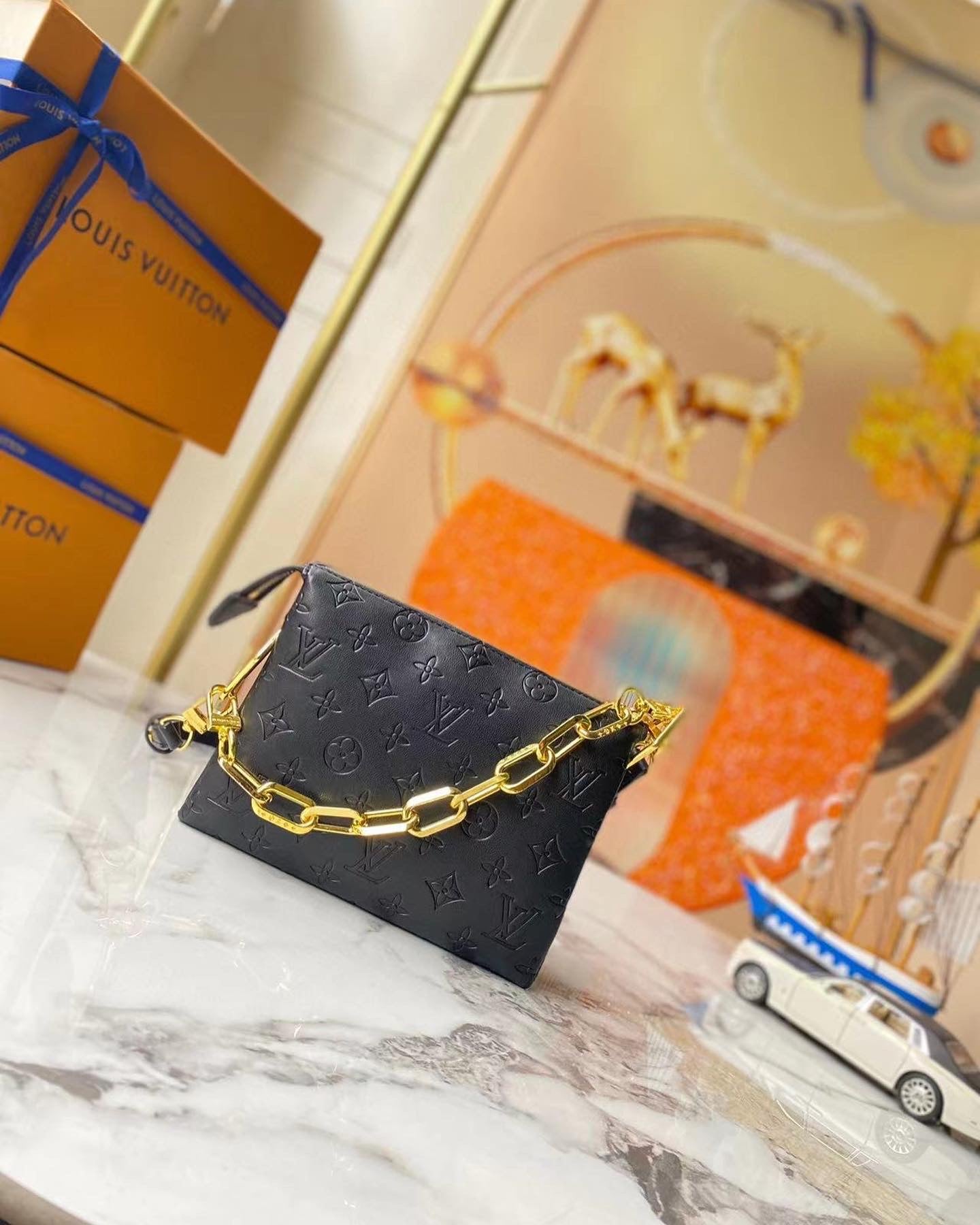 Fashioned from Monogram-embossed puffy lambskin, the compact Coussin BB handbag boasts a gold-color chunky chain in addition to its leather shoulder strap, both of which are removable. Two inside compartments bring functionality, making this the perfect day-to-evening bag. The luxurious inside lining adds a glamourous feel.