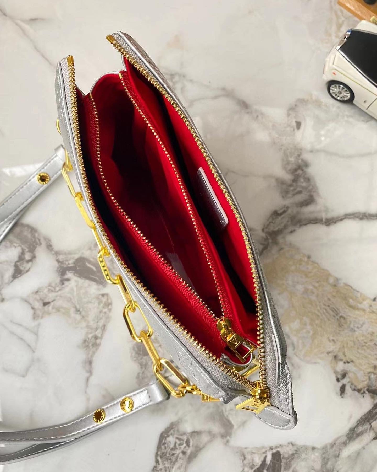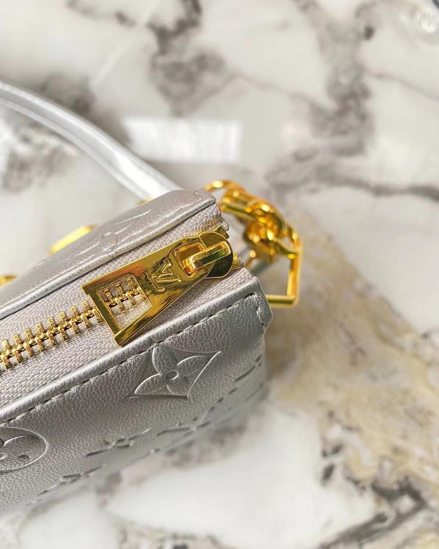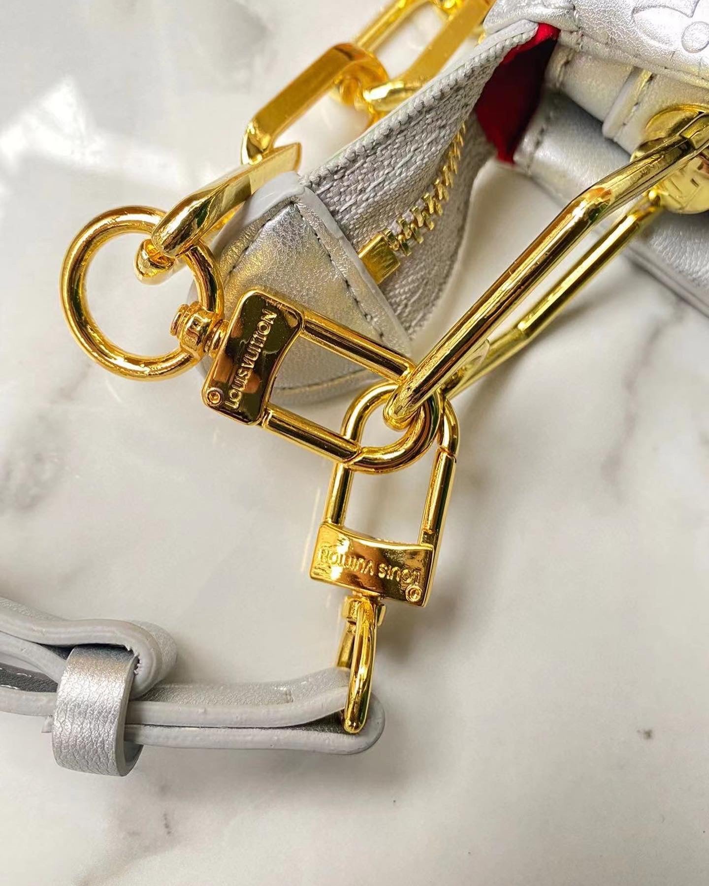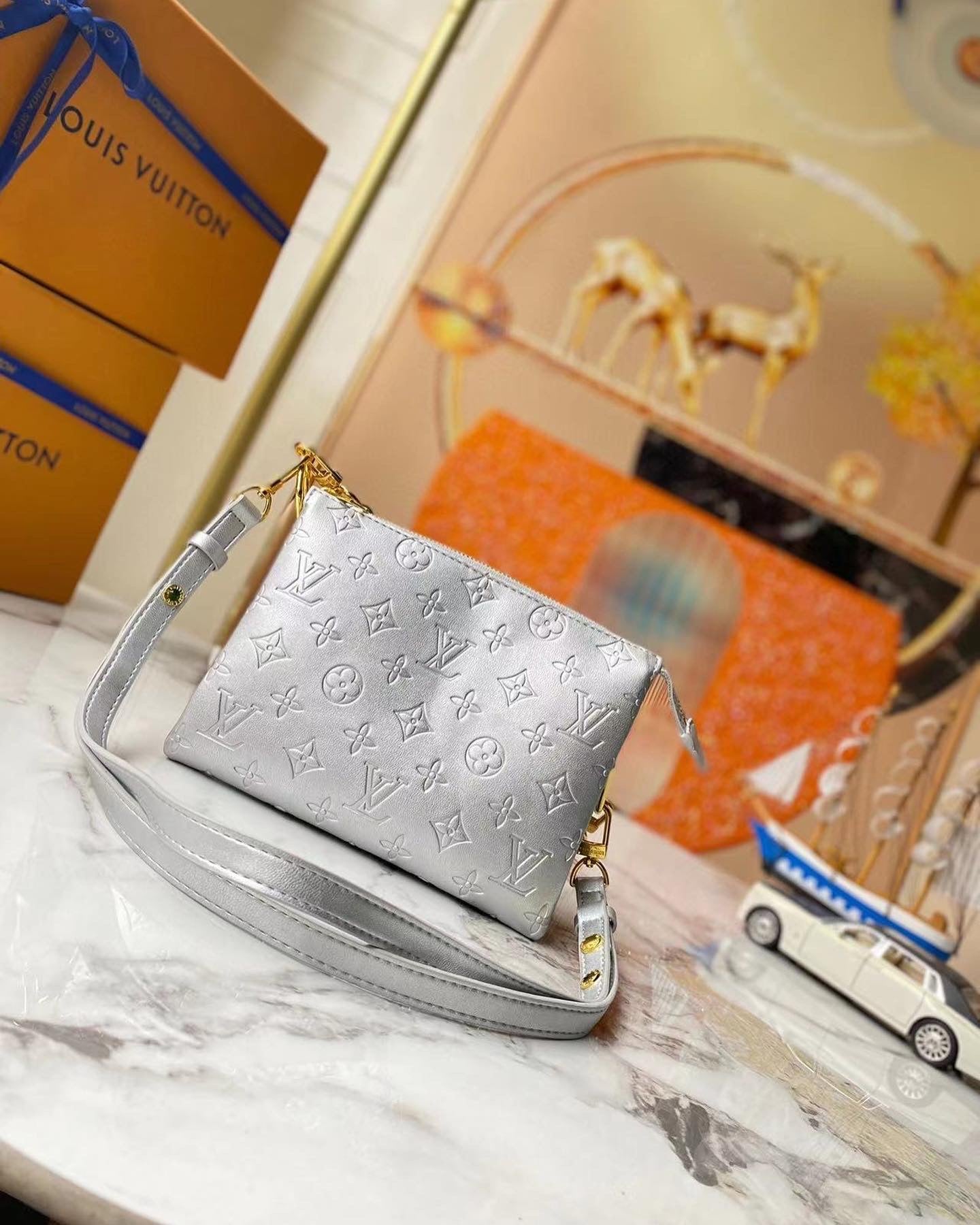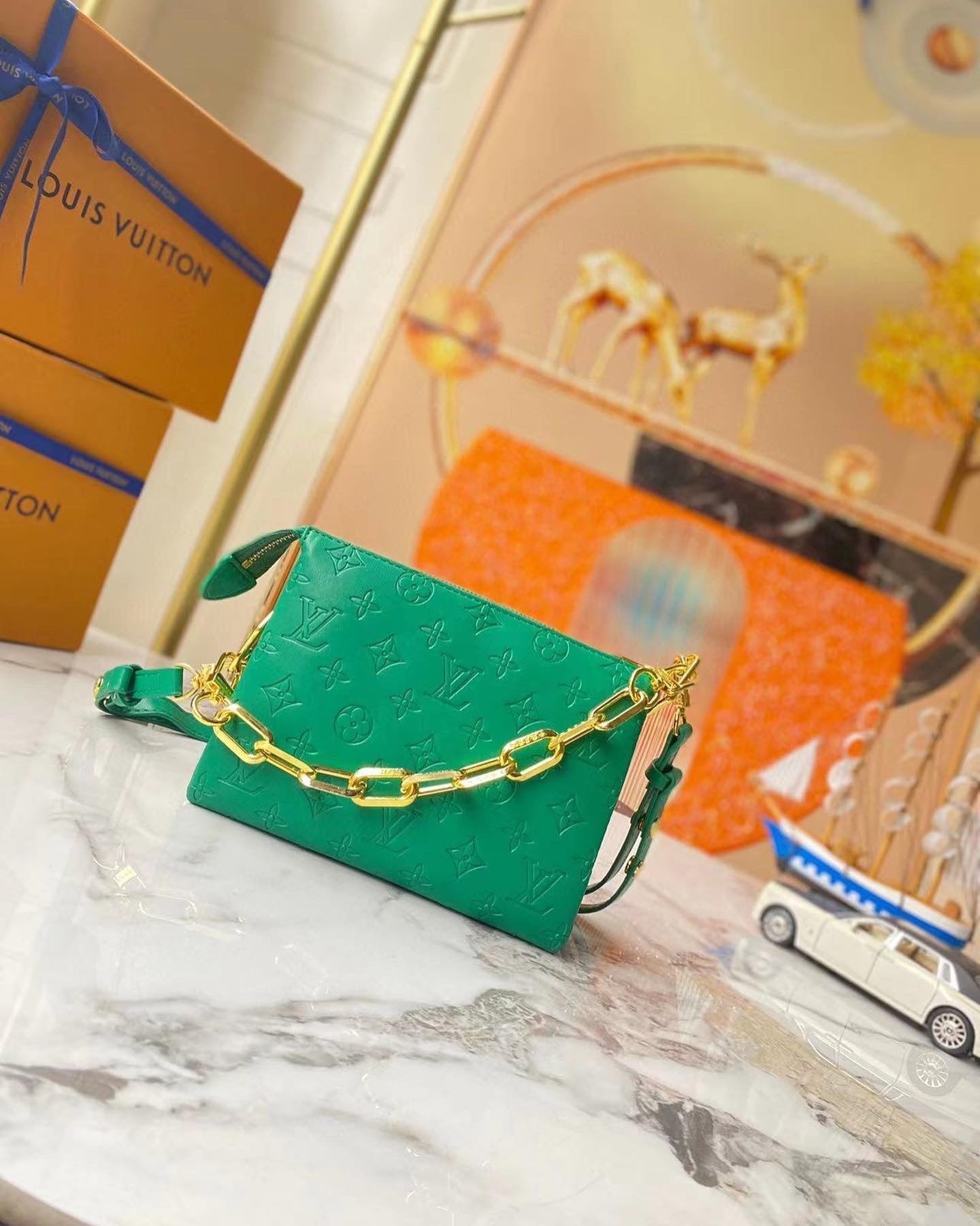 Fashioned from Monogram-embossed puffy lambskin, the compact Coussin BB handbag boasts a gold-color chunky chain in addition to its leather shoulder strap, both of which are removable. Two inside compartments bring functionality, making this the perfect day-to-evening bag. The luxurious inside lining adds a glamourous feel.