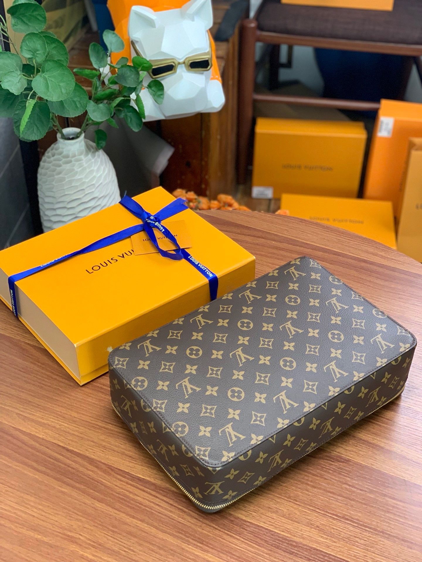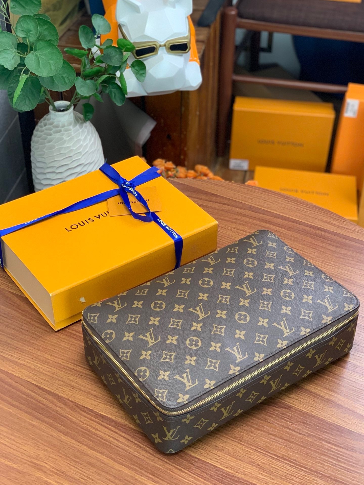 The Packing Cube GM(14.57 x 3.15 x 9.45 inches ) in Monogram canvas with natural-leather trim is Louis Vuitton’s latest contribution to the Art of Packing. Although designed for organizing the interior of luggage, it can also be used store items upon arrival.