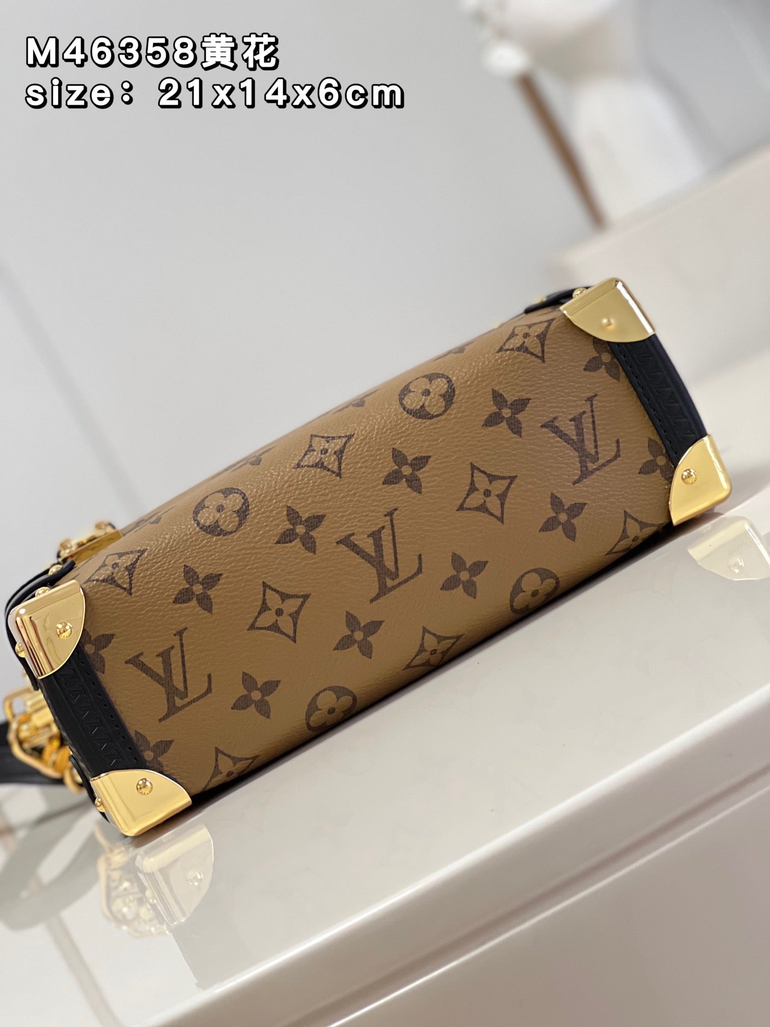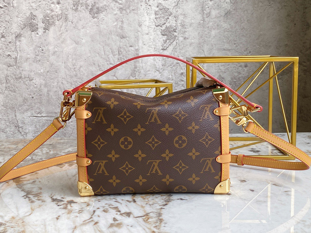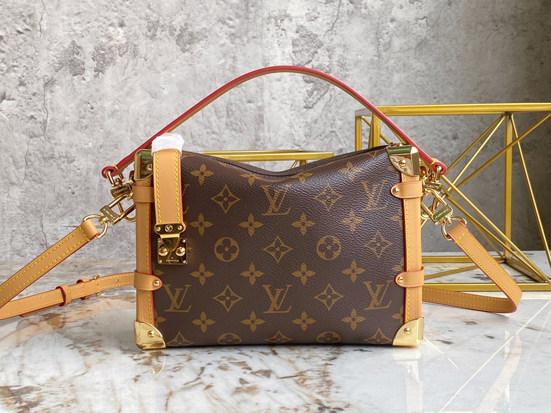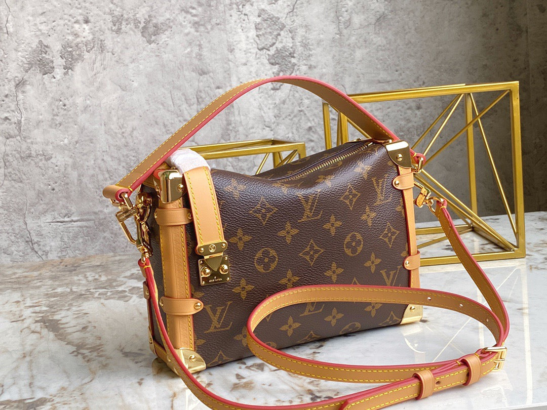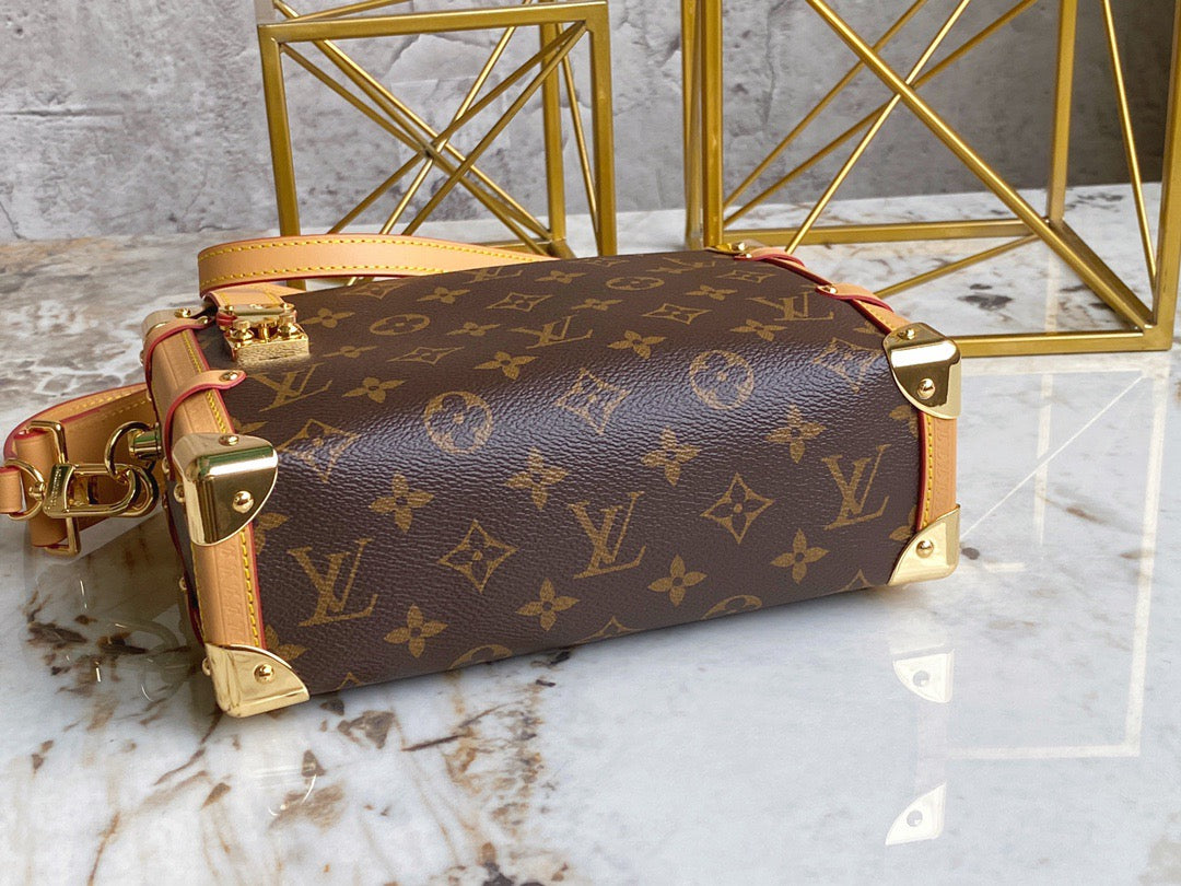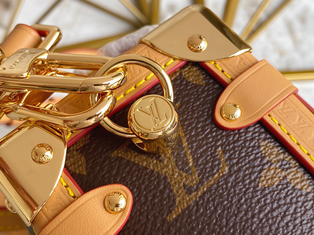Returning to the House’s trunkmaking beginnings, Nicolas Ghesquière creates the Side Trunk PM handbag in Monogram canvas with leather trim. What strikes the eye is the singularity of the leather zip tab fitted with the iconic S-lock and the reinforced metallic corners. The wide top handle is removable as is the thin leather shoulder strap.