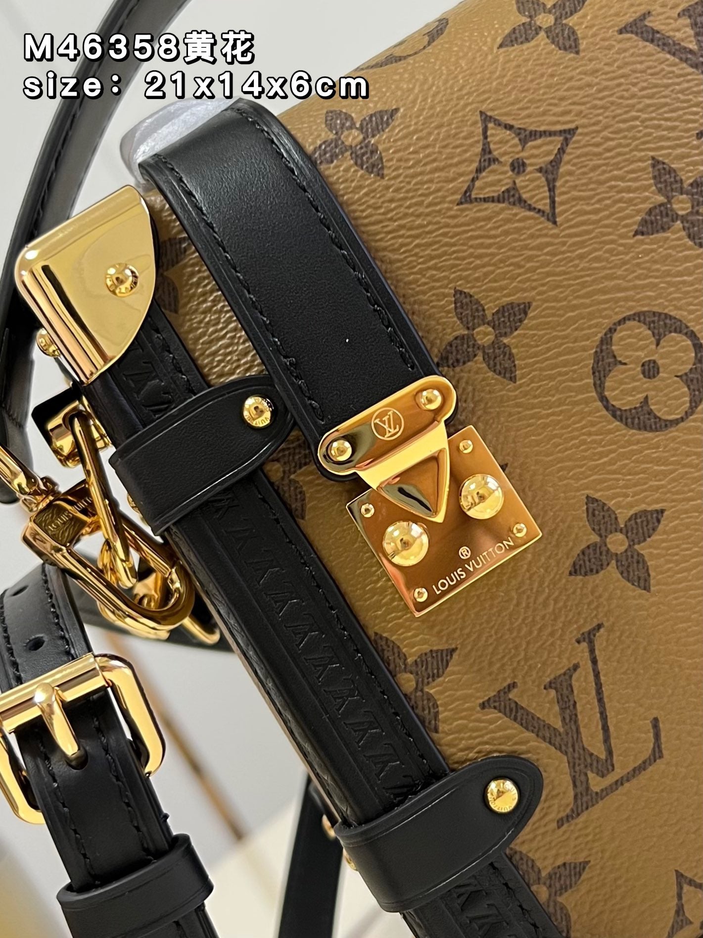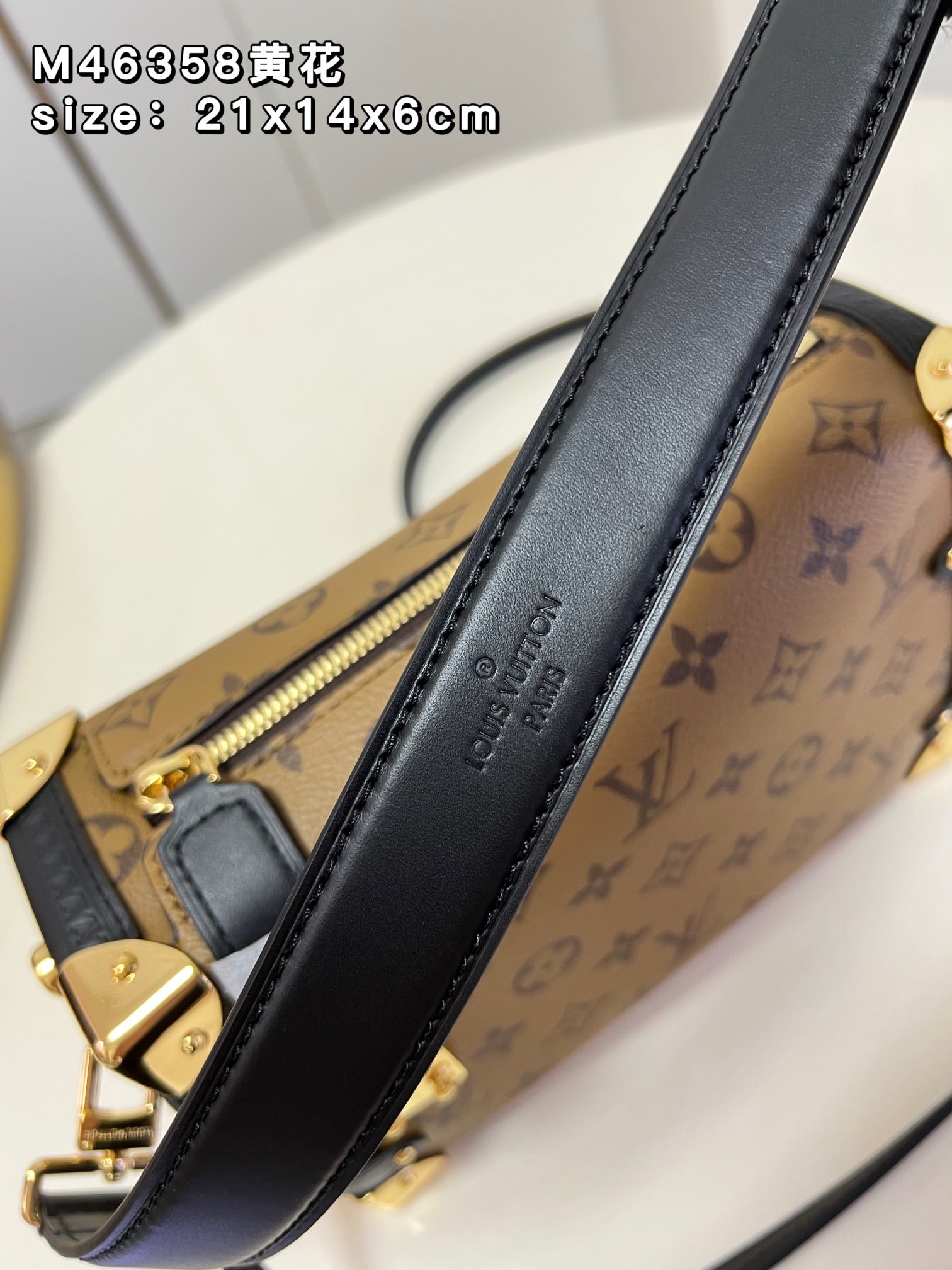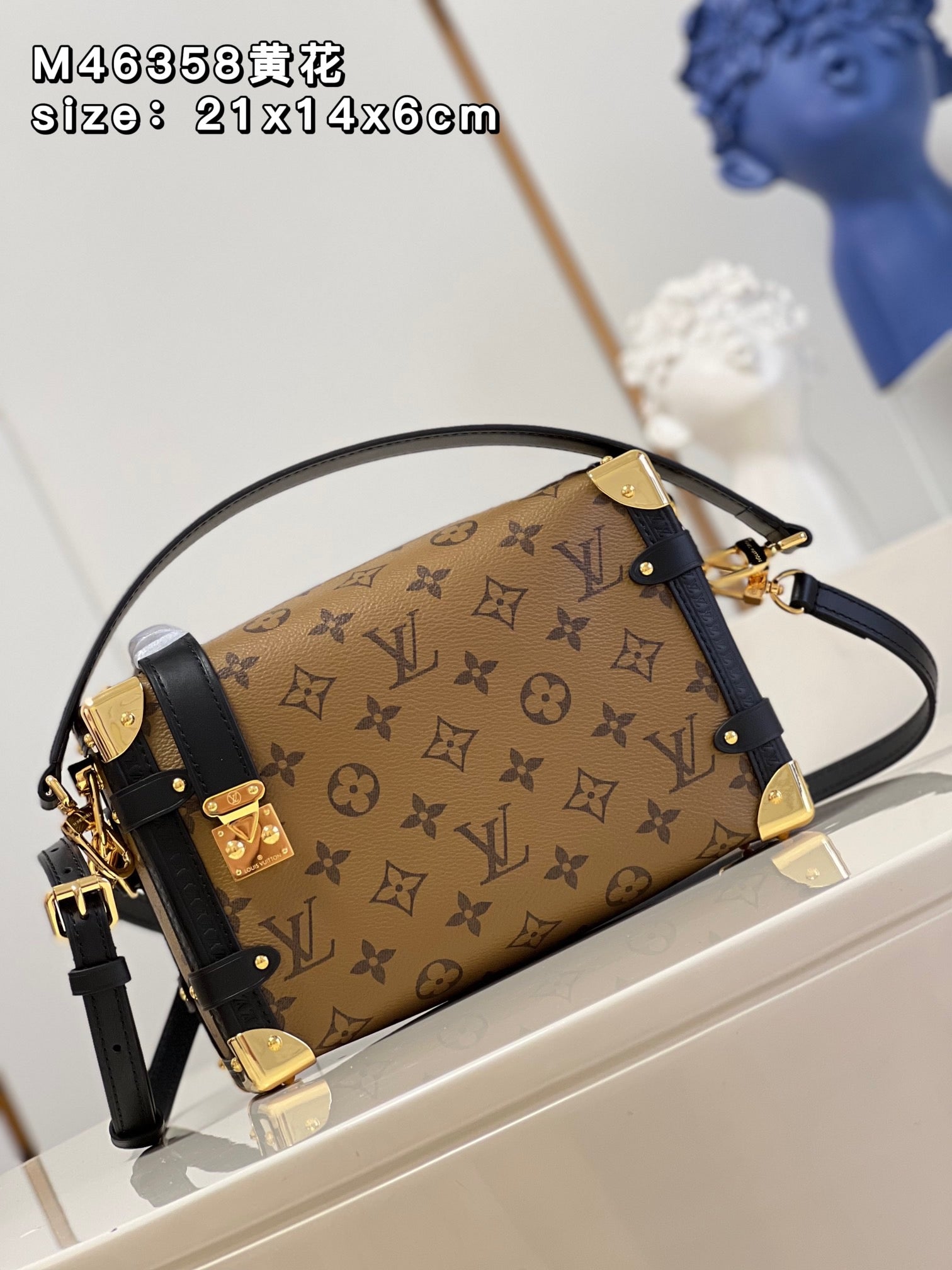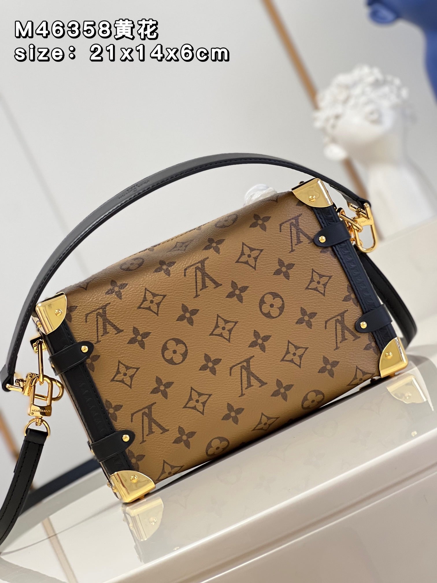 Returning to the House’s trunkmaking beginnings, Nicolas Ghesquière creates the Side Trunk PM handbag in Monogram canvas with leather trim. What strikes the eye is the singularity of the leather zip tab fitted with the iconic S-lock and the reinforced metallic corners. The wide top handle is removable as is the thin leather shoulder strap.
