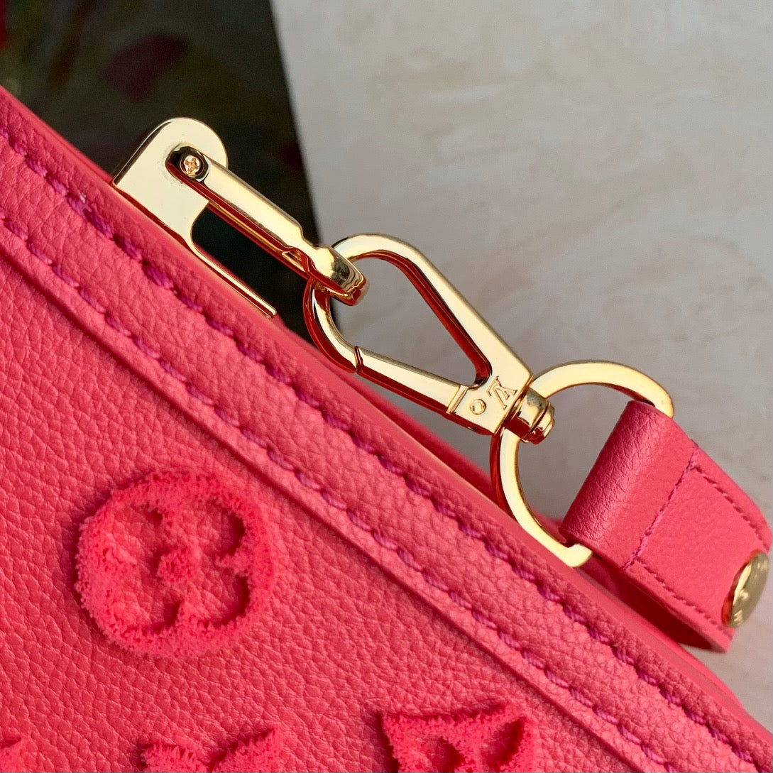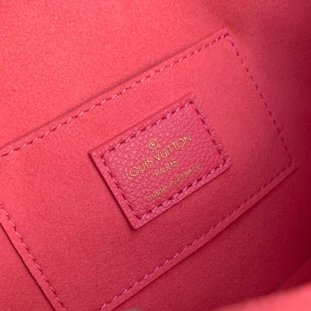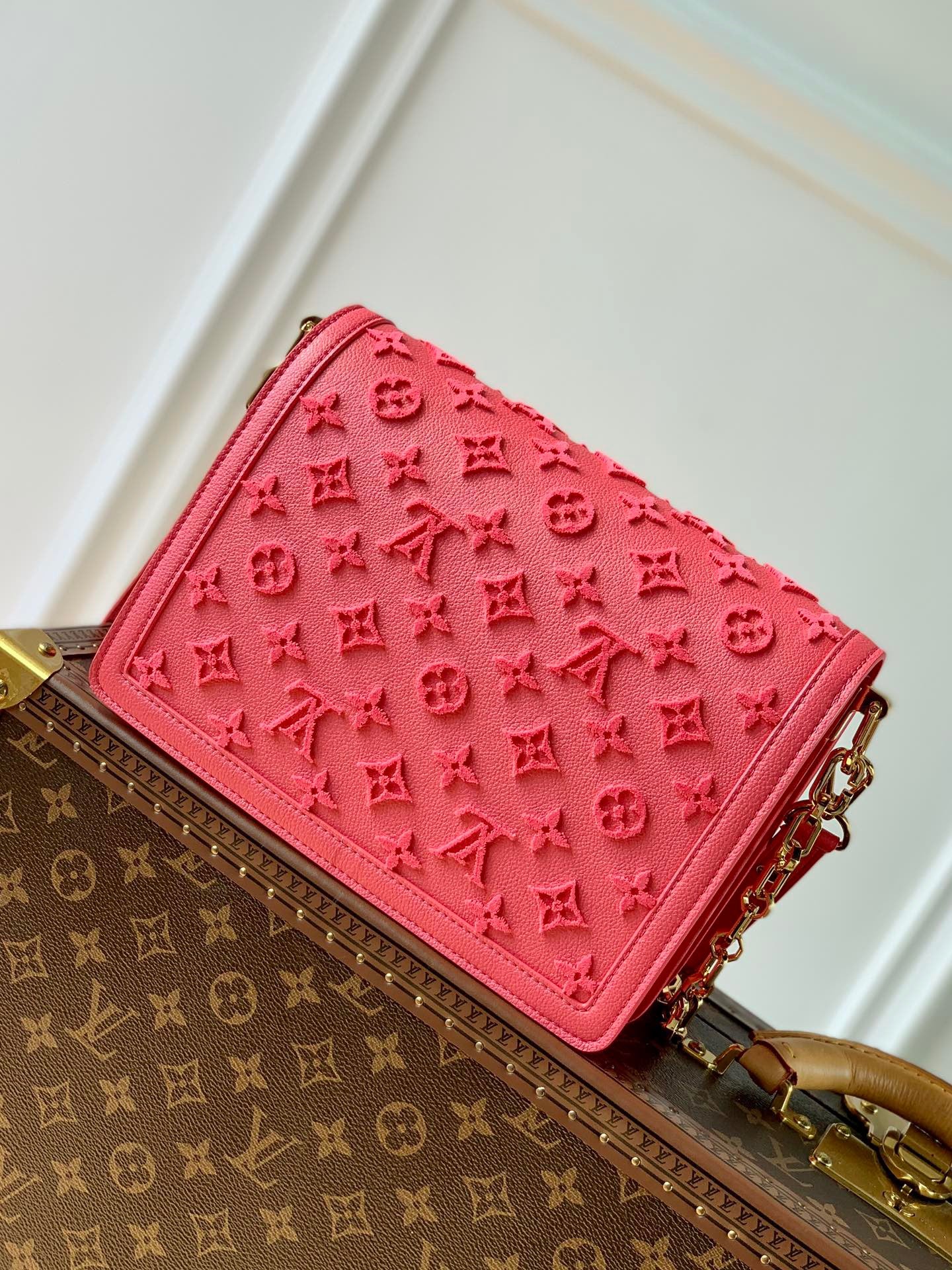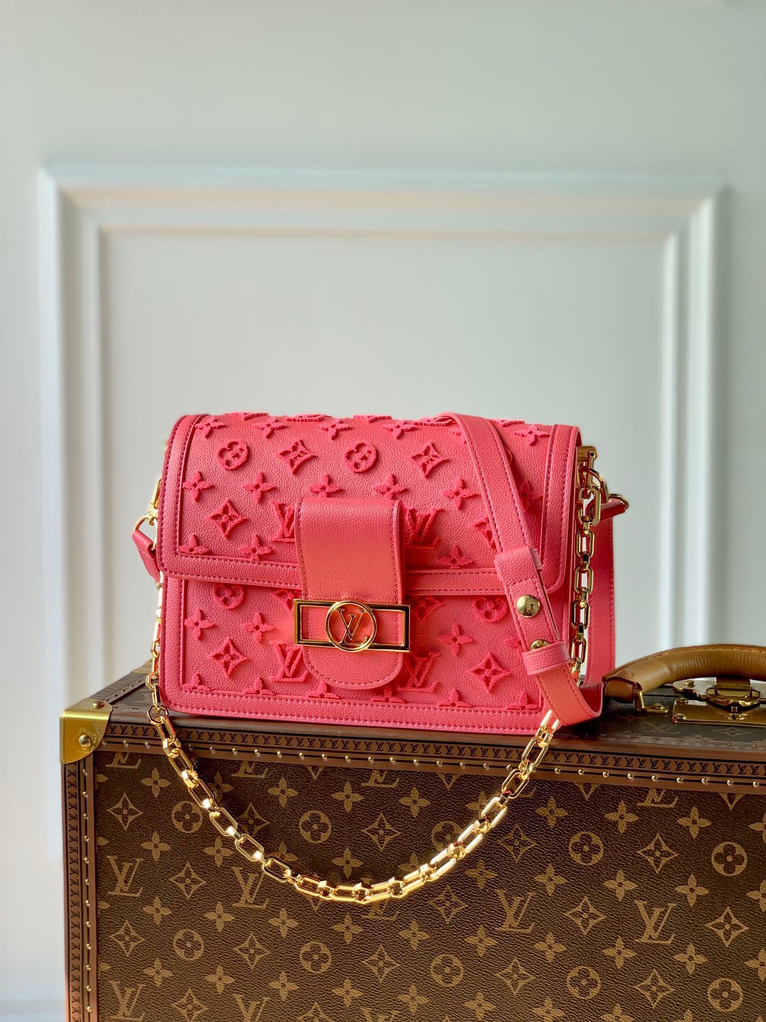 Part of the LV Rose Fluo capsule collection, this Mini Dauphine handbag in bright-pink calfskin fuses an audacious colorway with a soft feel thanks to the tufted Monogram motif embordered into the leather. Velvety to the touch, the leather tufting illustrates the House’s superior leather craftsmanship and gives the bag a modern look.