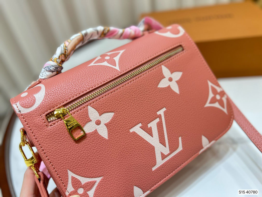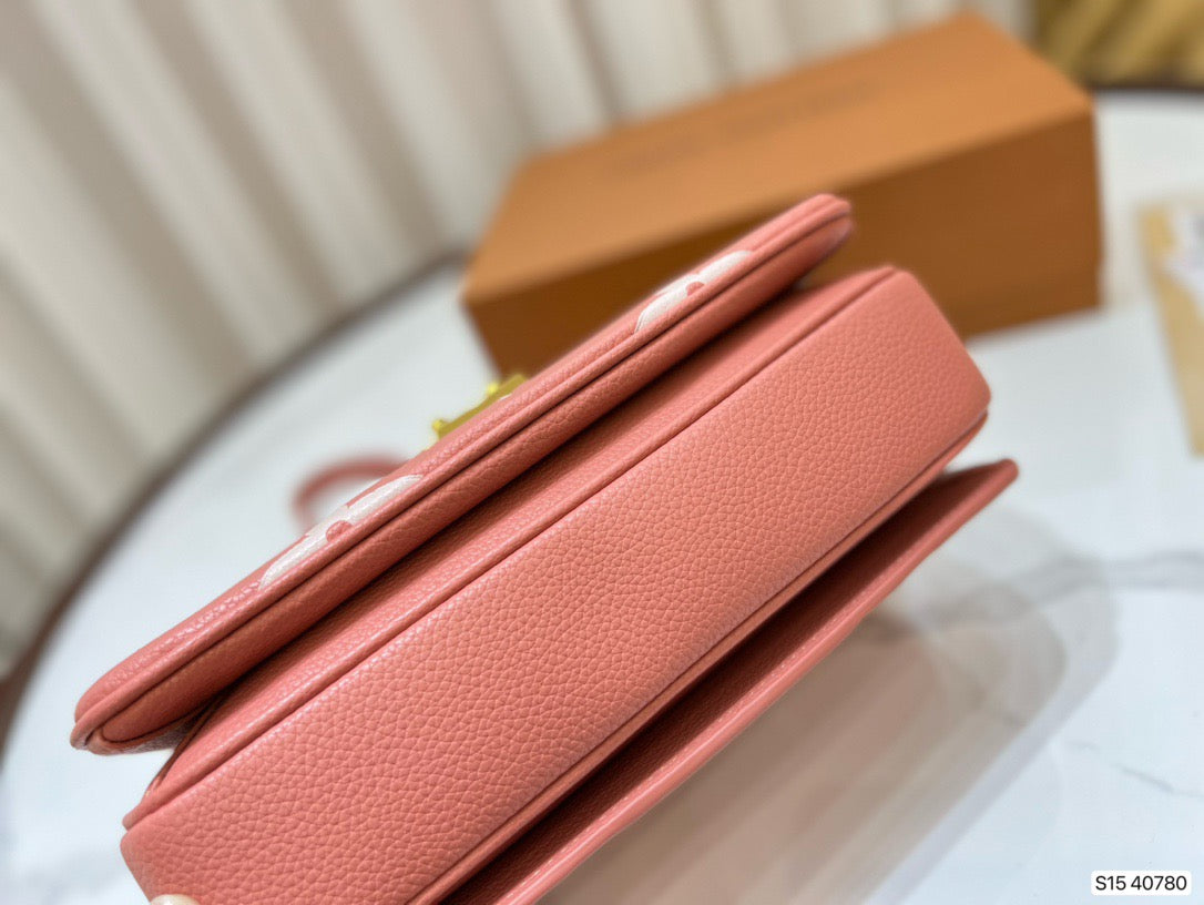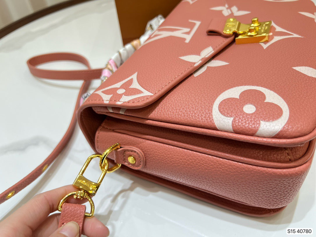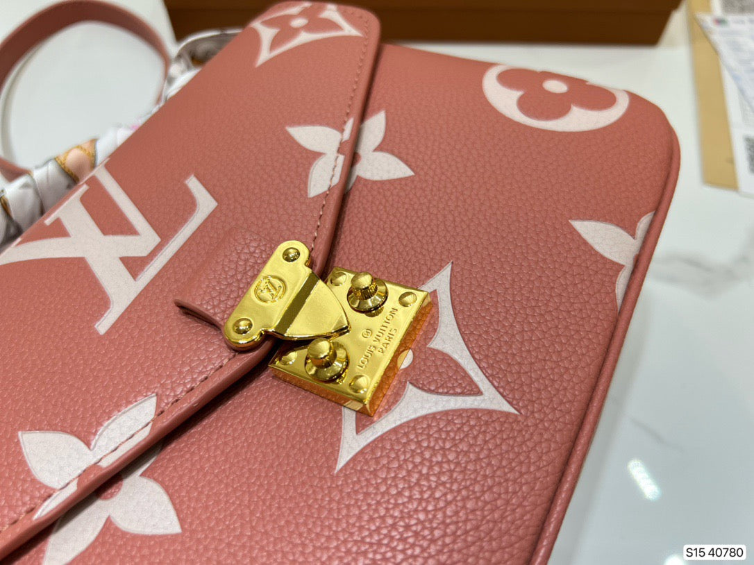 Made from pink grained leather with the Monogram motif embossed then printed on the supple leather in a cream color, the Pochette Métis becomes even more desirable. The oversized pattern brings an eye-catching aspect to the lines of this distinctive bag, a scaled-down version of the classic satchel silhouette.