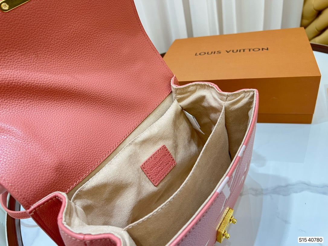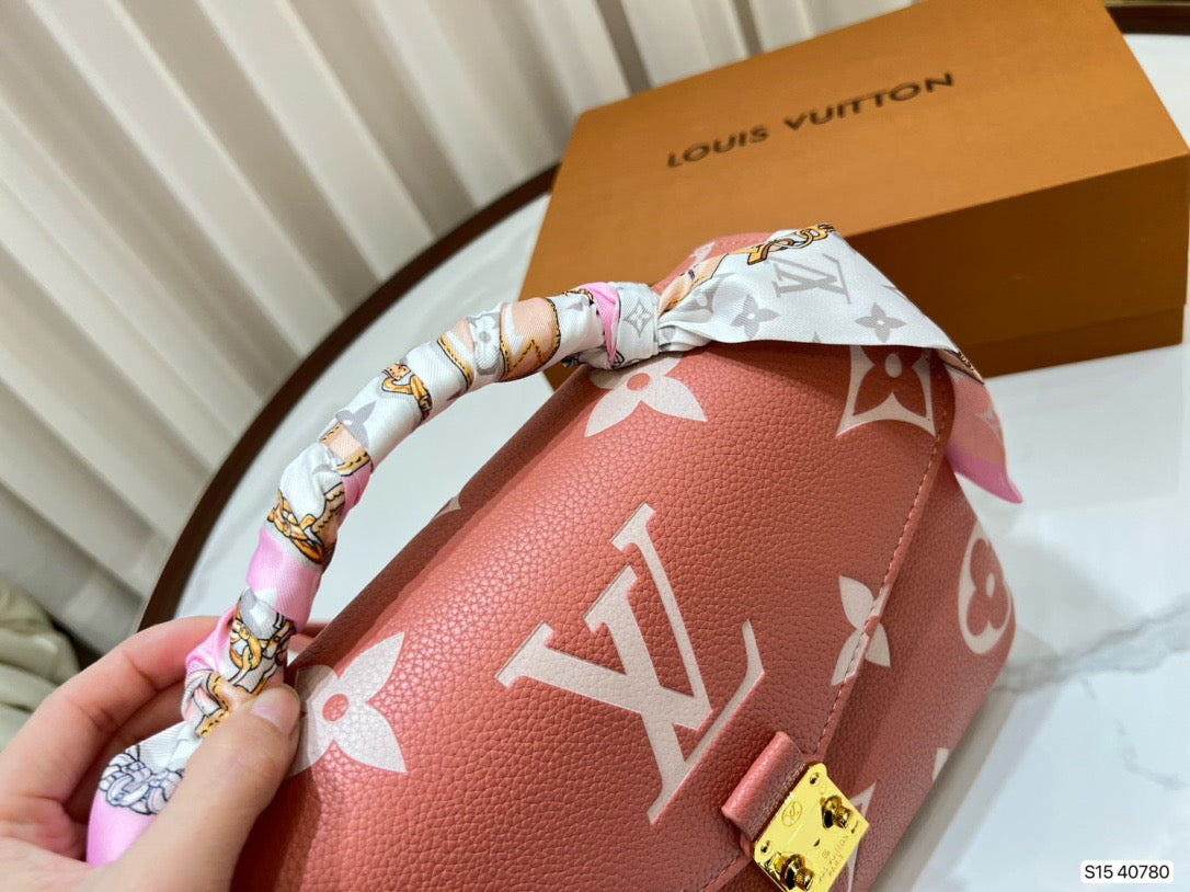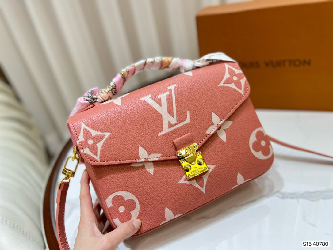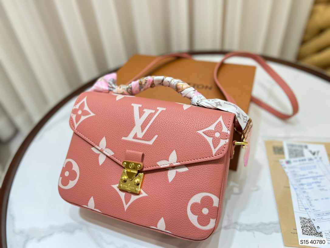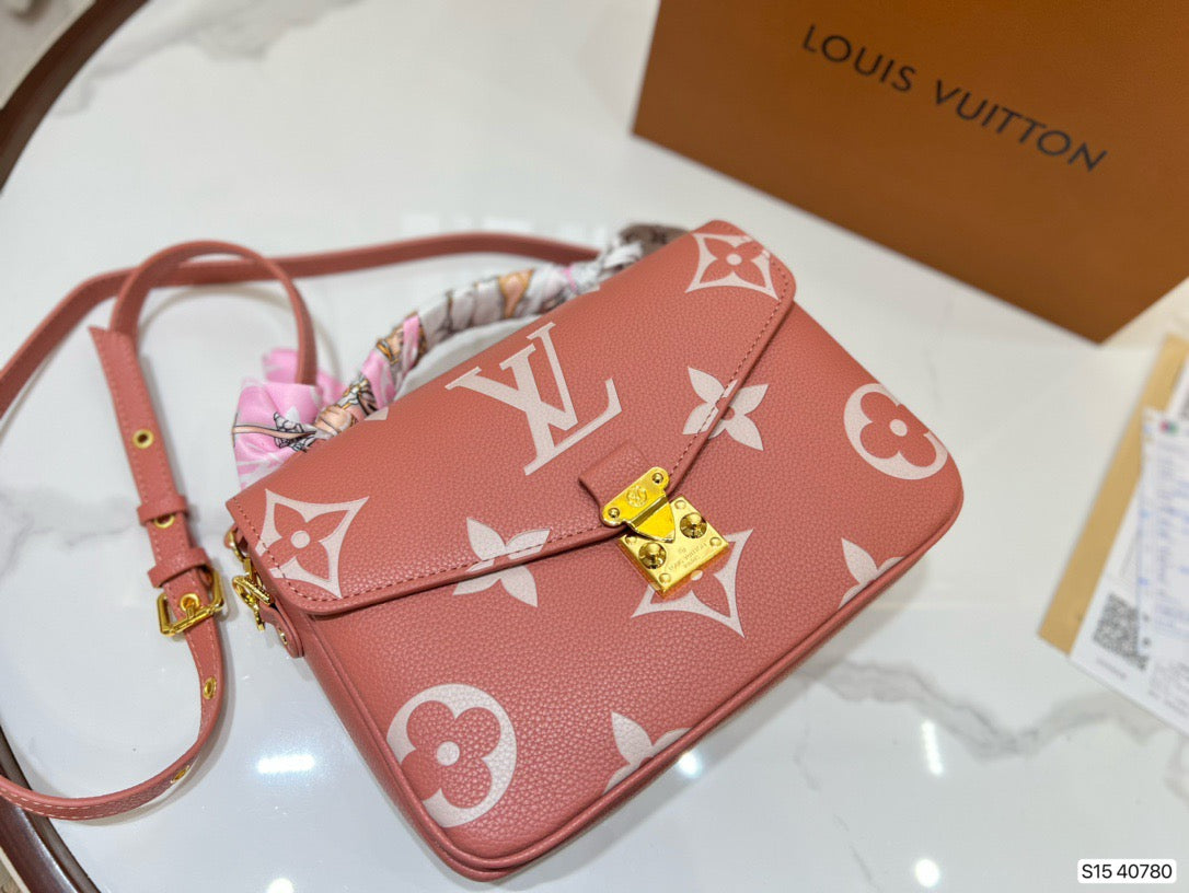 Made from pink grained leather with the Monogram motif embossed then printed on the supple leather in a cream color, the Pochette Métis becomes even more desirable. The oversized pattern brings an eye-catching aspect to the lines of this distinctive bag, a scaled-down version of the classic satchel silhouette.