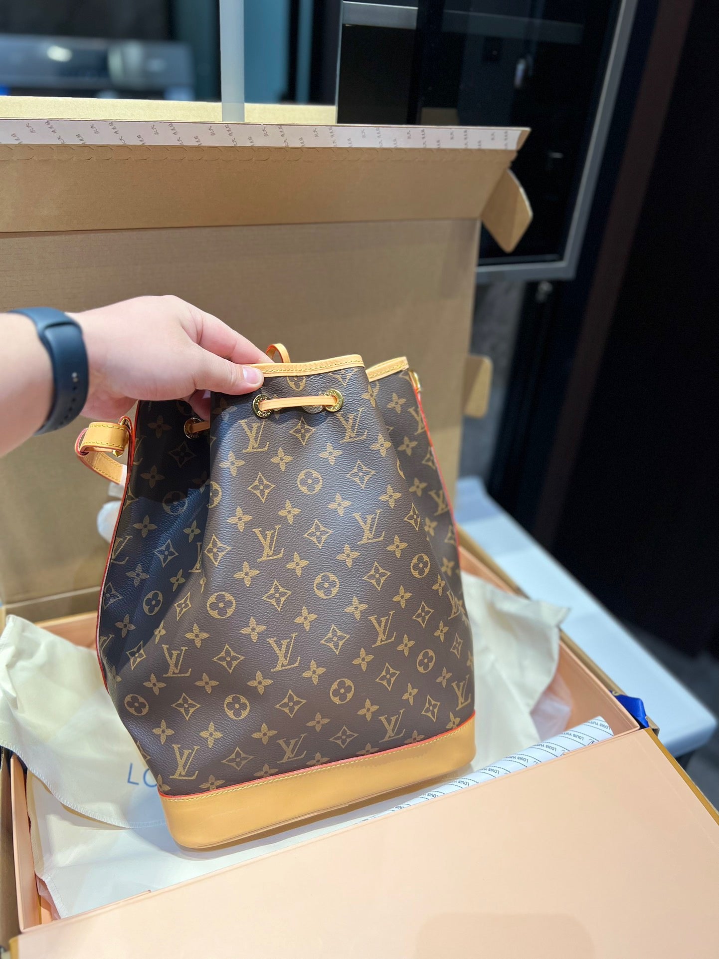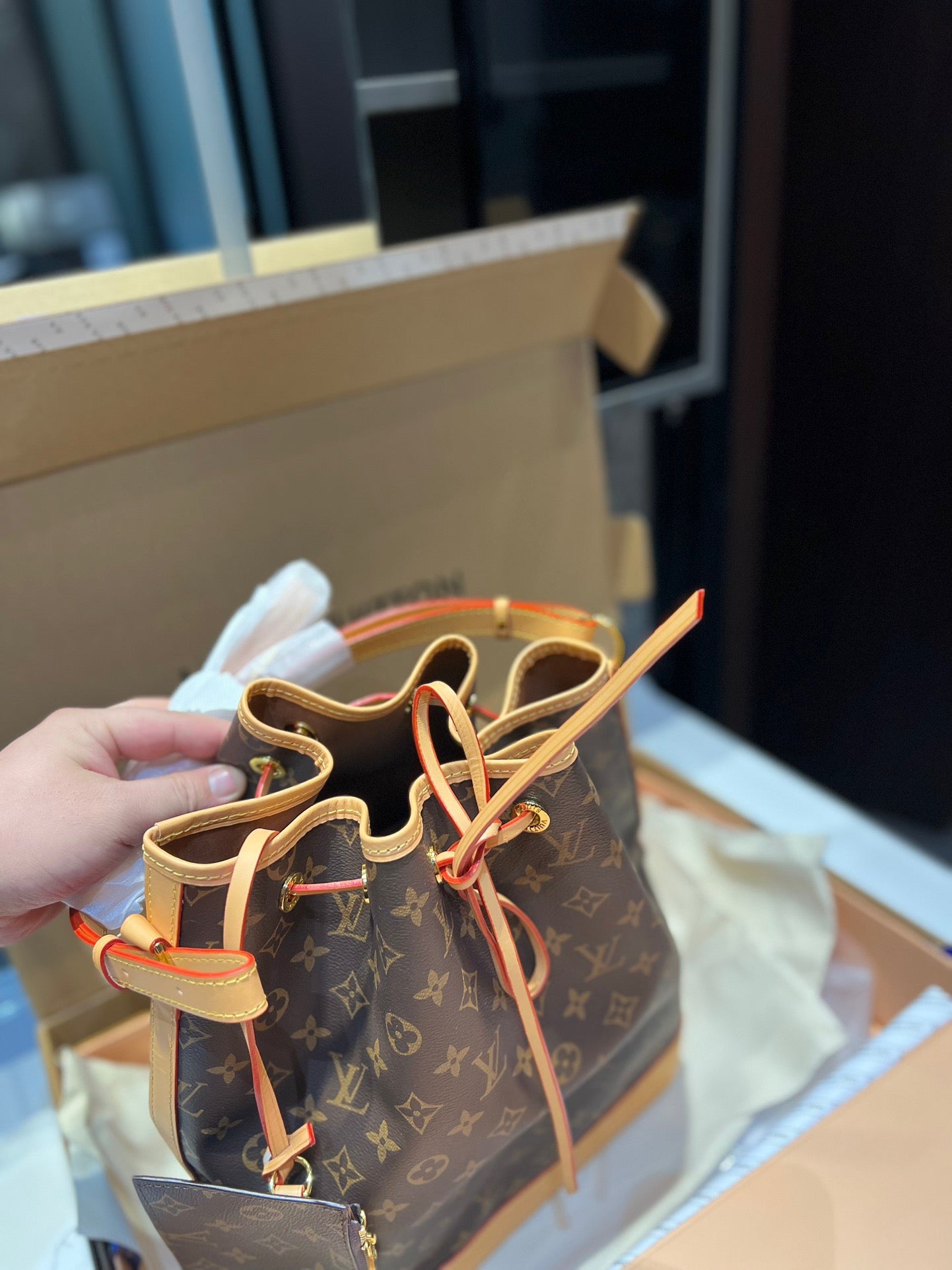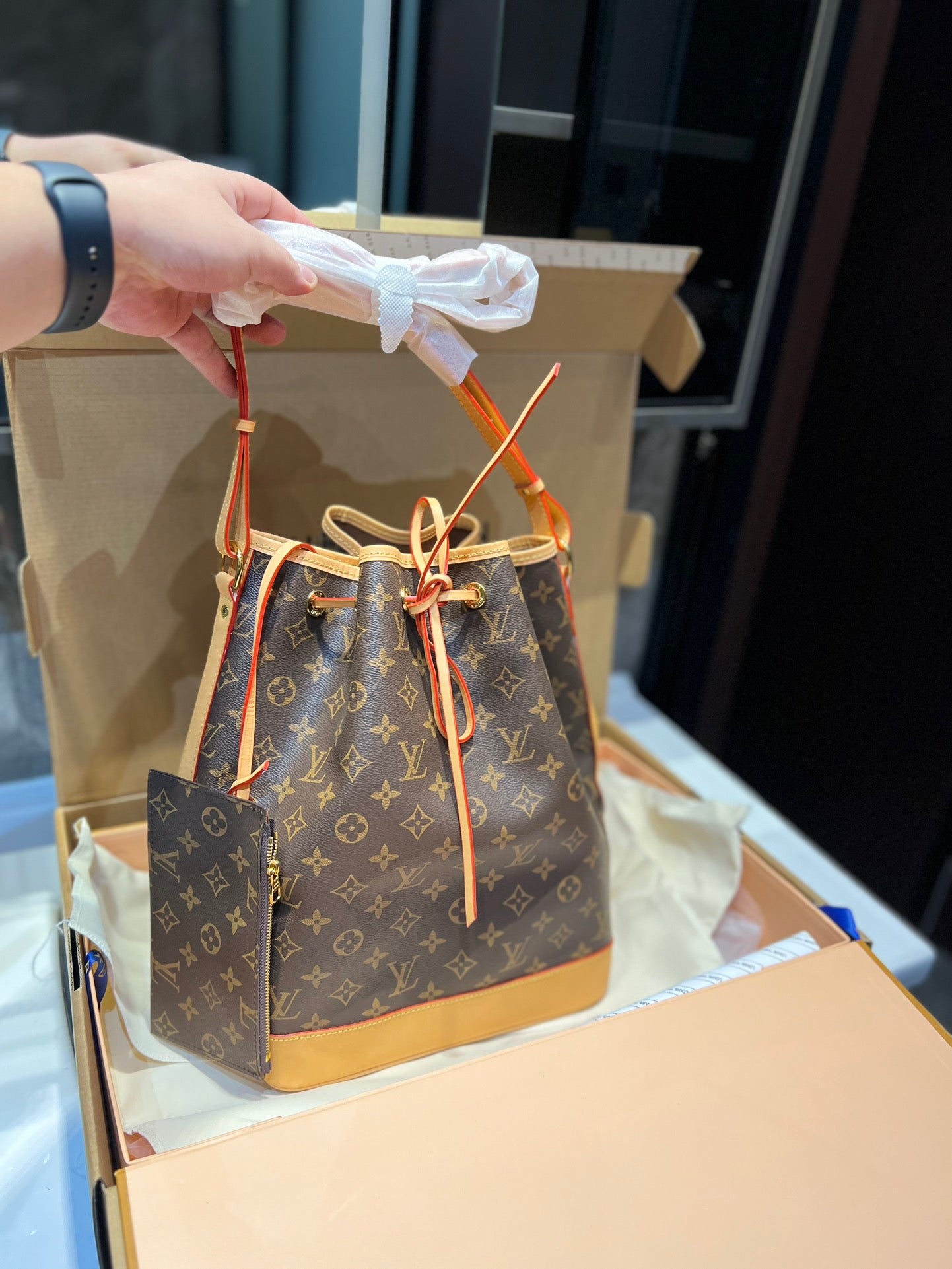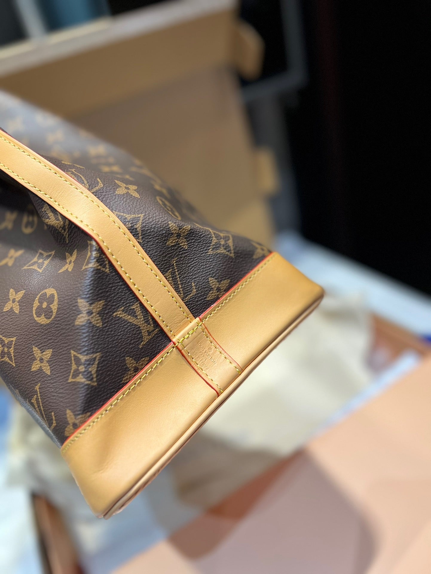 The Noé bucket bag harks back to a design from 1932. A Champagne producer asked Gaston-Louis Vuitton to develop a sturdy, stylish bag in which he could transport five bottles of bubbly. This model in body-friendly Monogram canvas retains key features of the original – the iconic shape, generous volume, drawstring closure – but is made for modern life. The leather strap adjusts for comfortable shoulder wear.