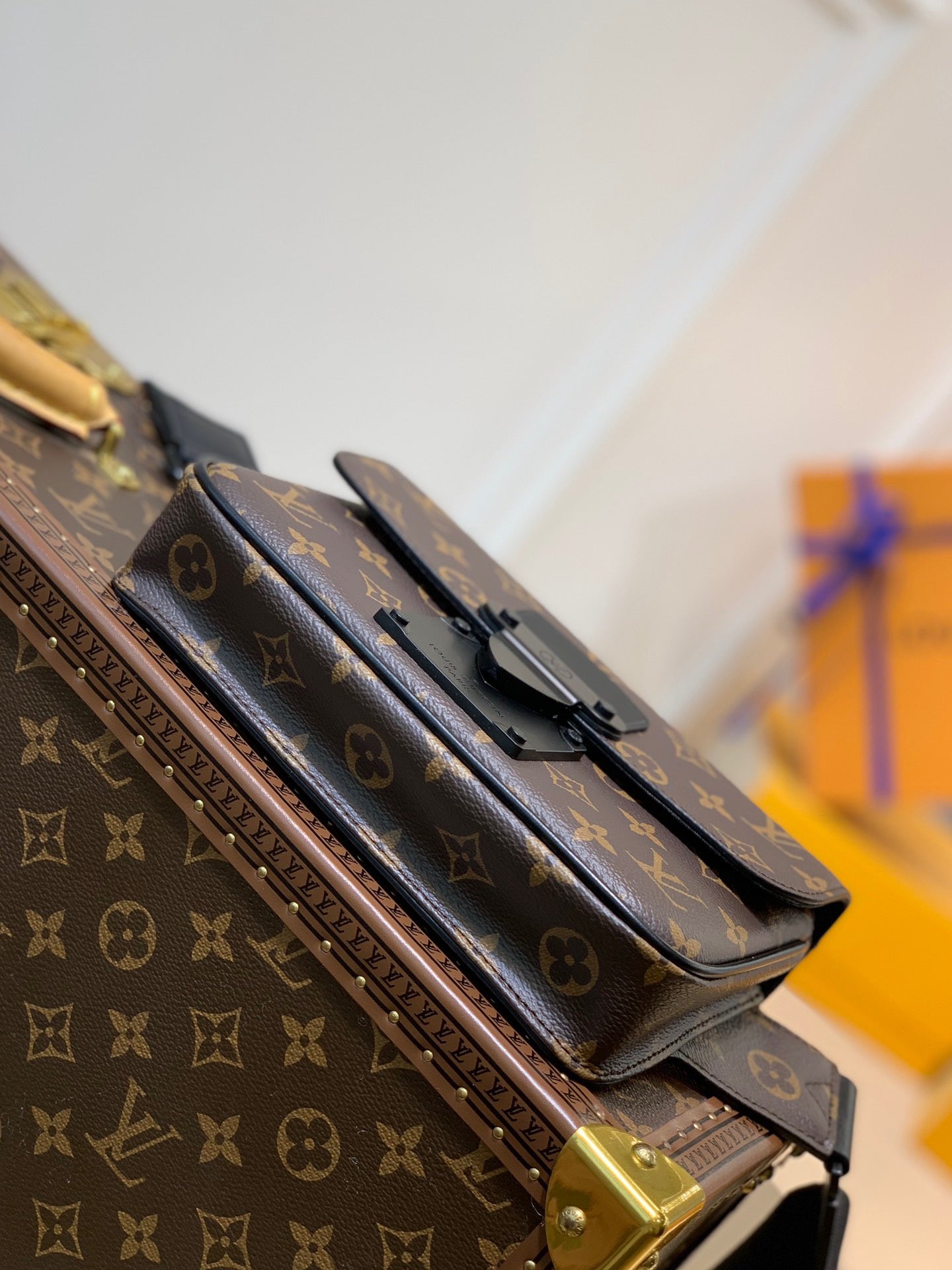 The new S Lock Sling Bag keeps personal items secure with a magnetic closure inspired by Louis Vuitton’s historic trunk clasps. Monogram Macassar canvas is accented by an innovative metal lock with an elegant matte black finish. A sturdy trunk-style leather handle and an adjustable strap, both adorned with the LV signature, offer multiple carry options.