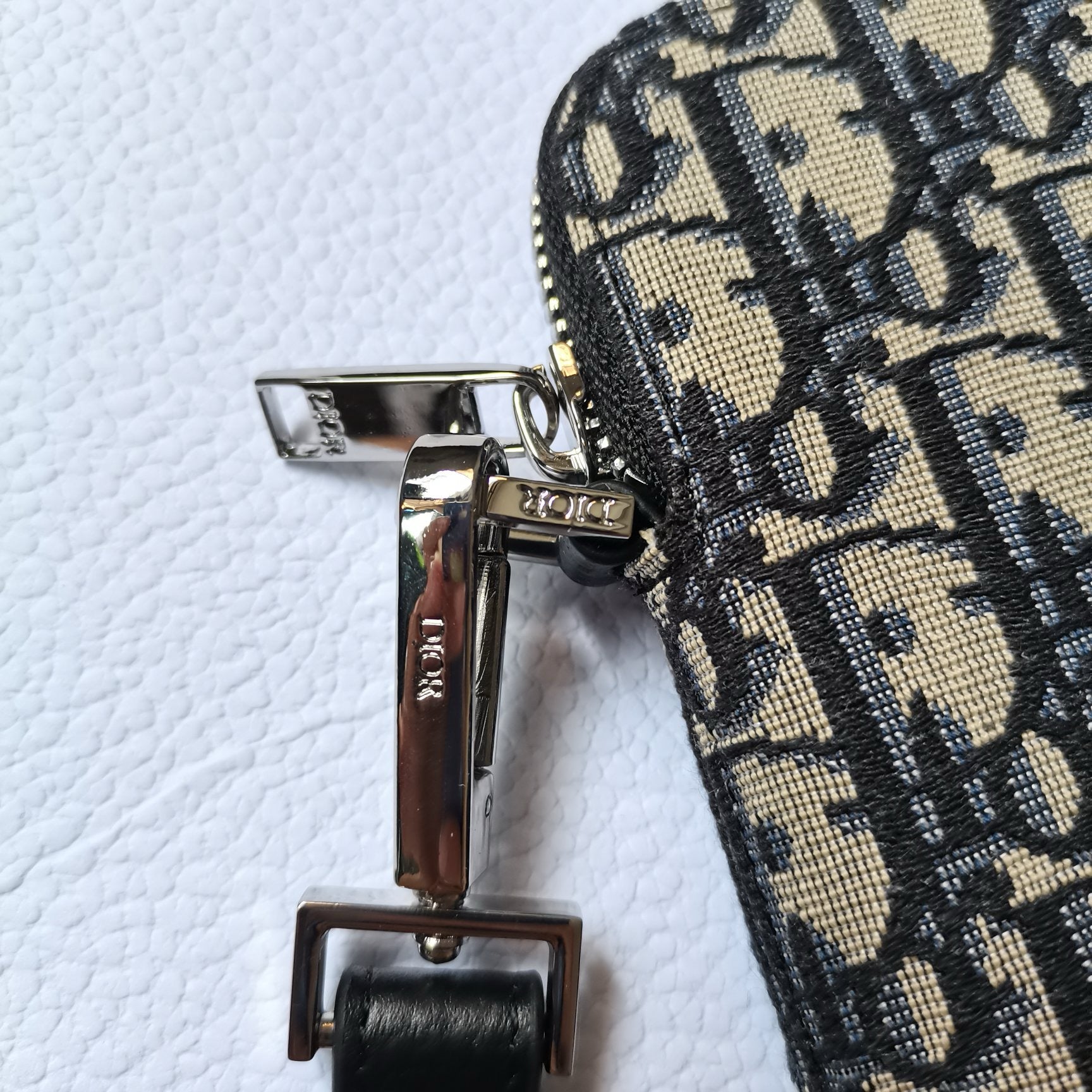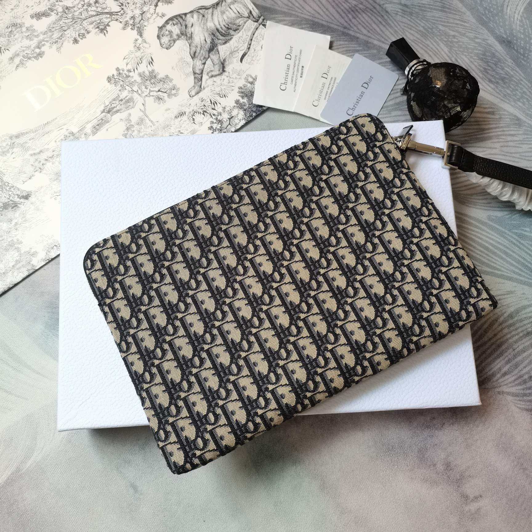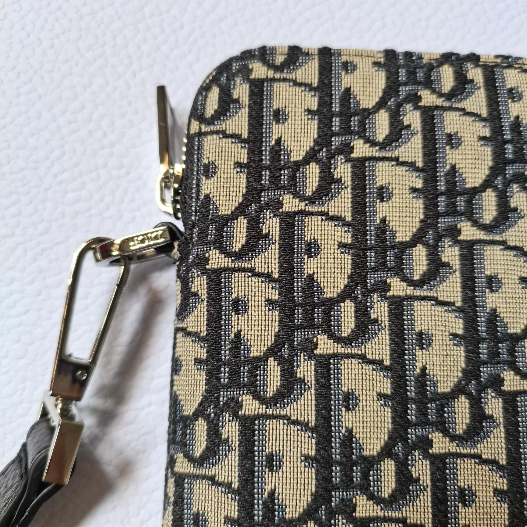 The pouch showcases the Dior Oblique motif, first seen on House creations in 1967. Crafted in beige and black Dior Oblique jacquard, it is embellished with a ruthenium-finish brass Dior signature on the front. Featuring a ruthenium-finish brass zipped closure, its smooth calfskin interior has three card slots as well as a phone compartment. The streamlined and spacious pouch is completed by a removable strap allowing it be carried by hand or slipped in a bag.