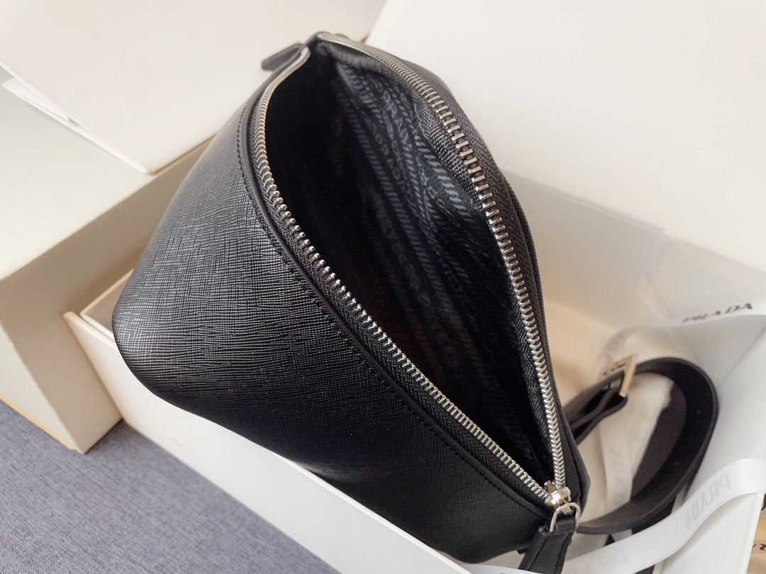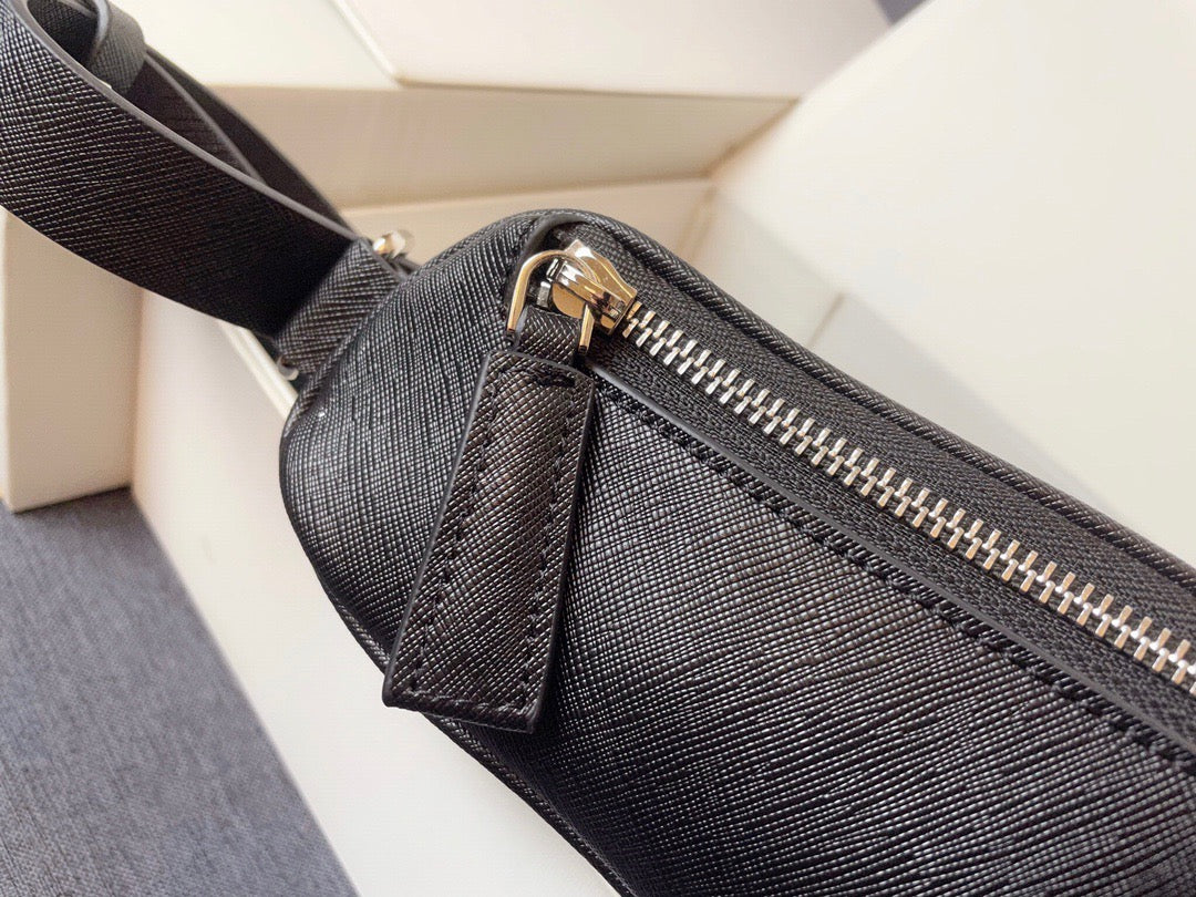 A study of the triangle inspires new geometric elements and novel interpretations of PD’s historic stylistic code. The iconic shape is presented again in this shoulder bag with sleek lines that comes with a strap for versatility. The tonal embossed logo and the enameled metal triangle logo on the back enhance the minimalist aesthetics.