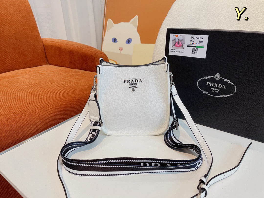 The sleek design of this leather mini shoulder bag is emphasized on the front by the metal triangle logo that adds an iconic note. The detachable logo-print woven tape shoulder strap emphasizes the contemporary character of the accessory.