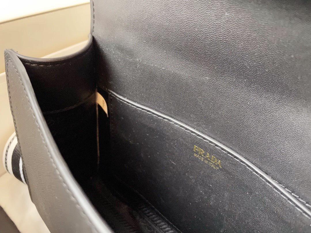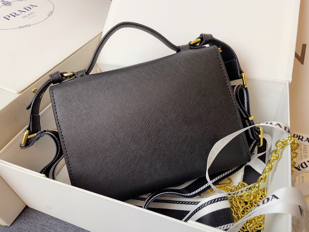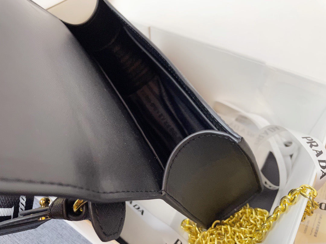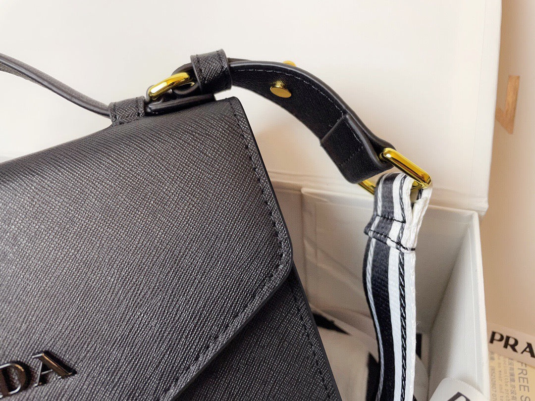 The refined design of the Prada Monochrome bag in Saffiano leather is emphasized by the tonal effect of the iconic logo. Clean elegant lines define the bag made versatile by the removable woven tape shoulder strap embroidered with the logo in a contrasting color