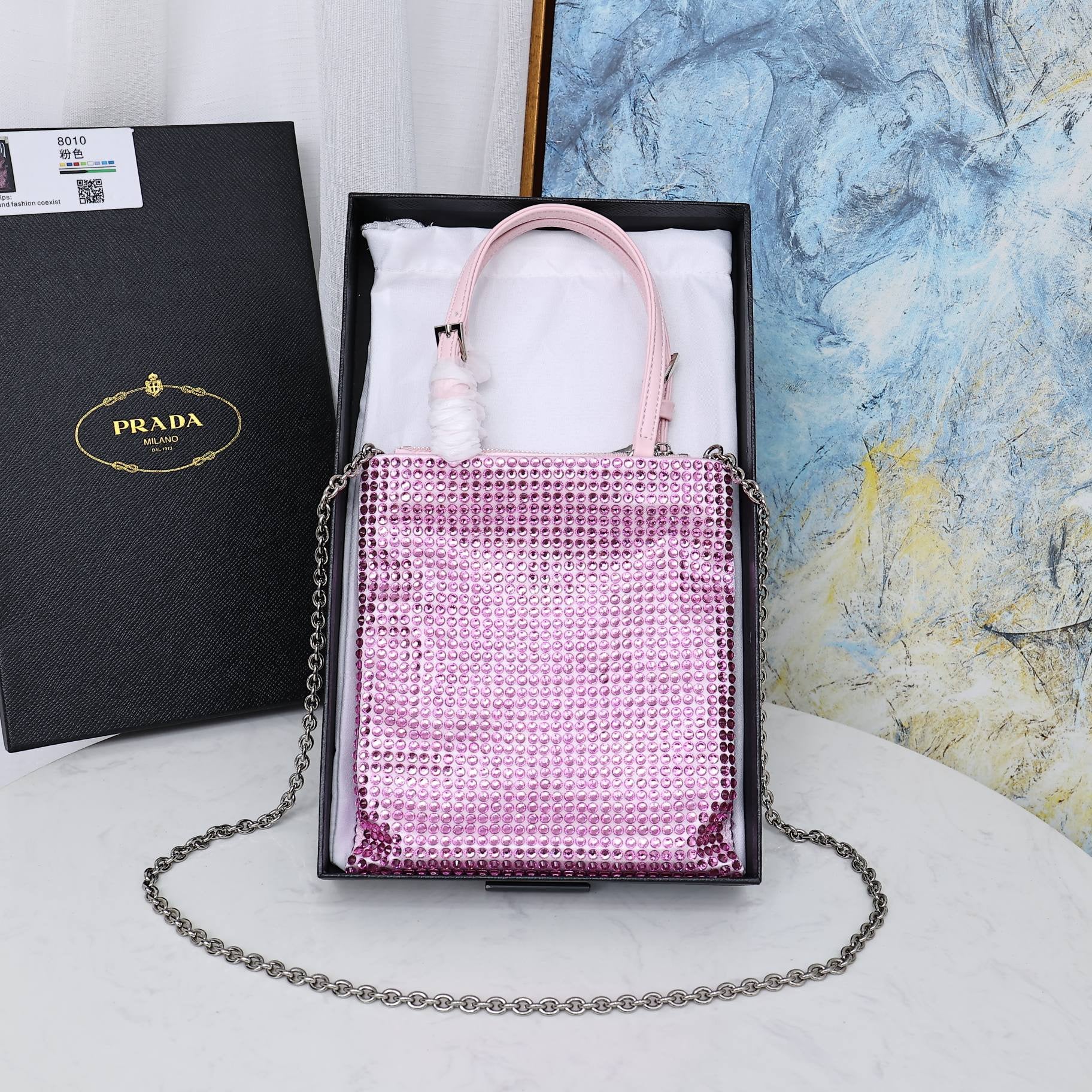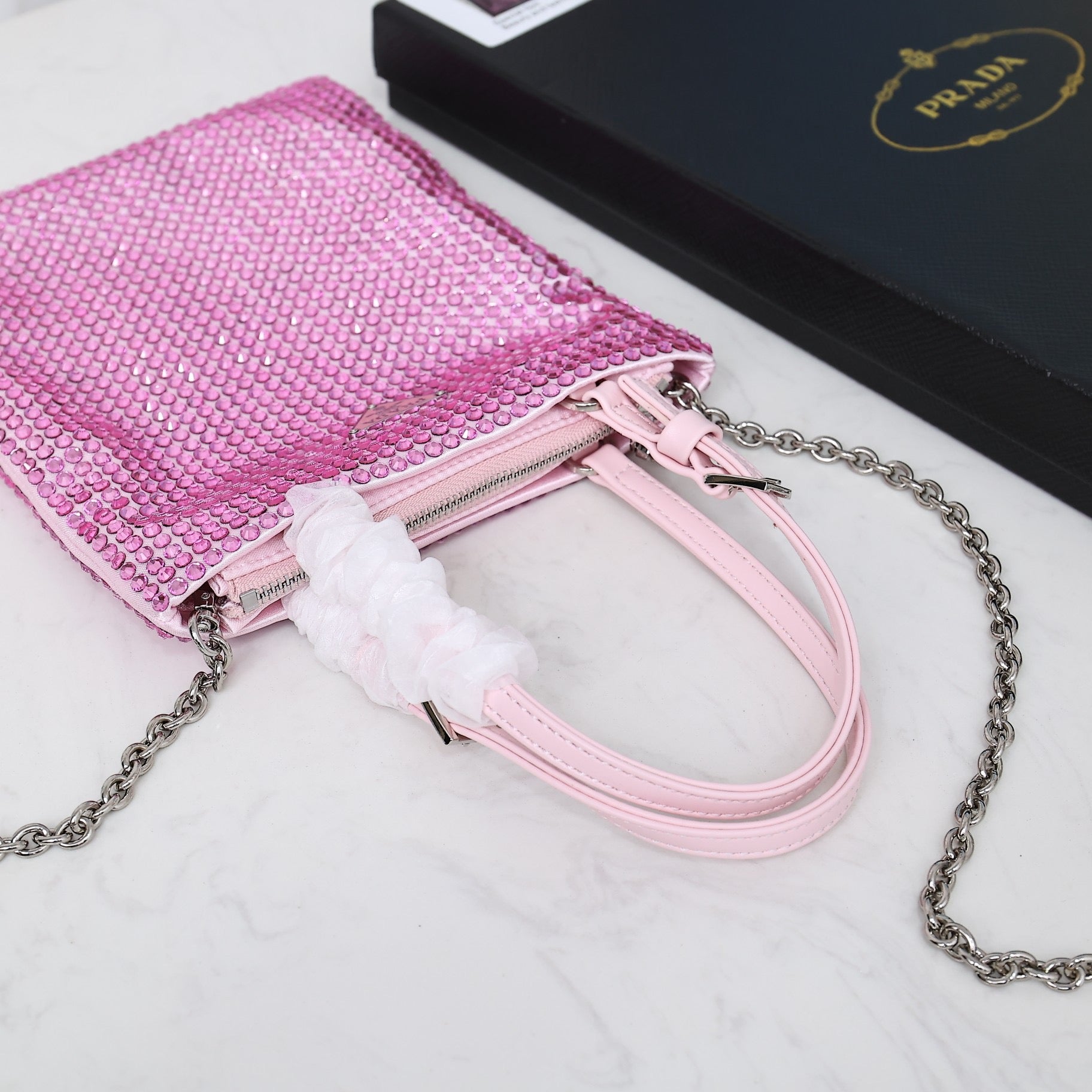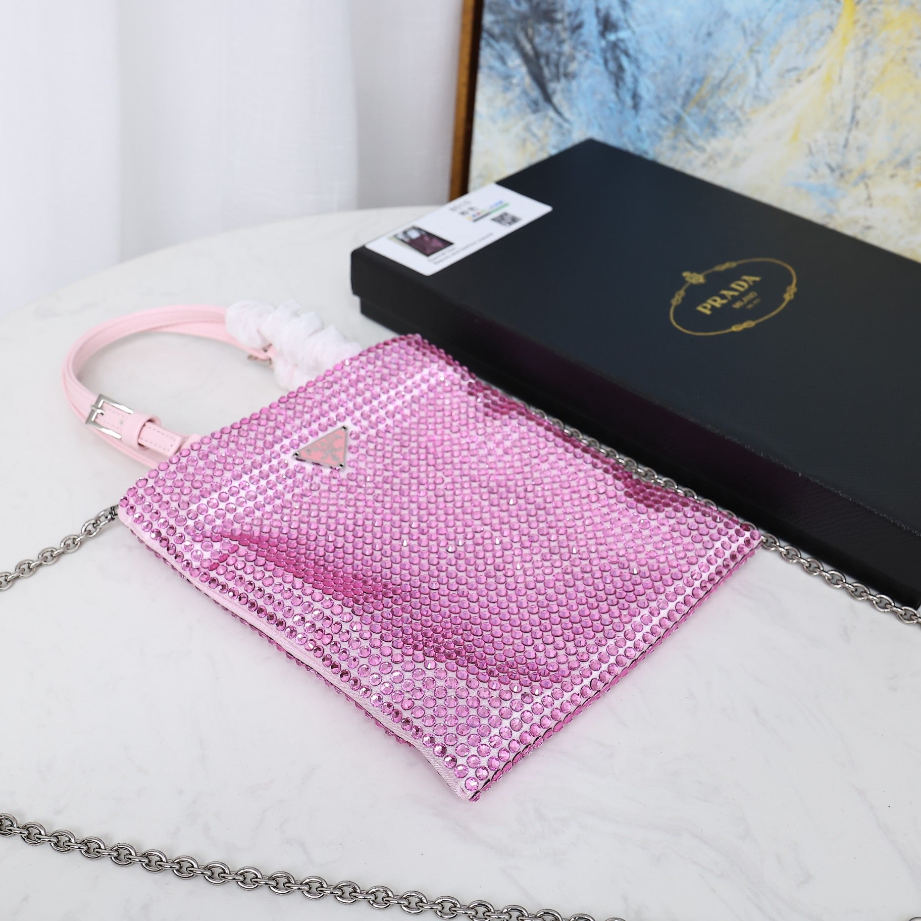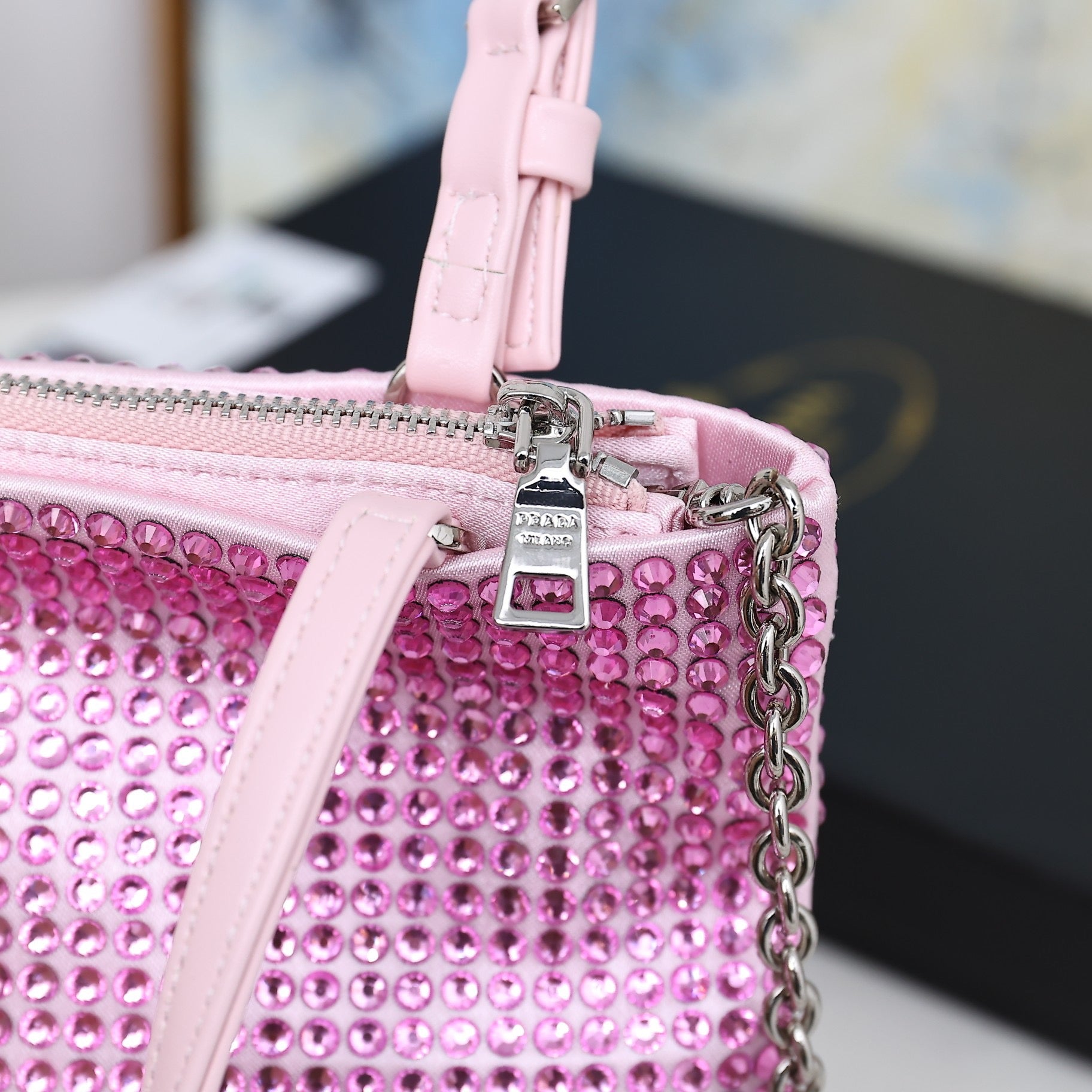 Embellished with all-over crystals, this satin bag stands out for its modern, feminine design characterized by a compact yet refined line. A play of light gives precious allure to this accessory decorated with the enameled metal triangle logo.