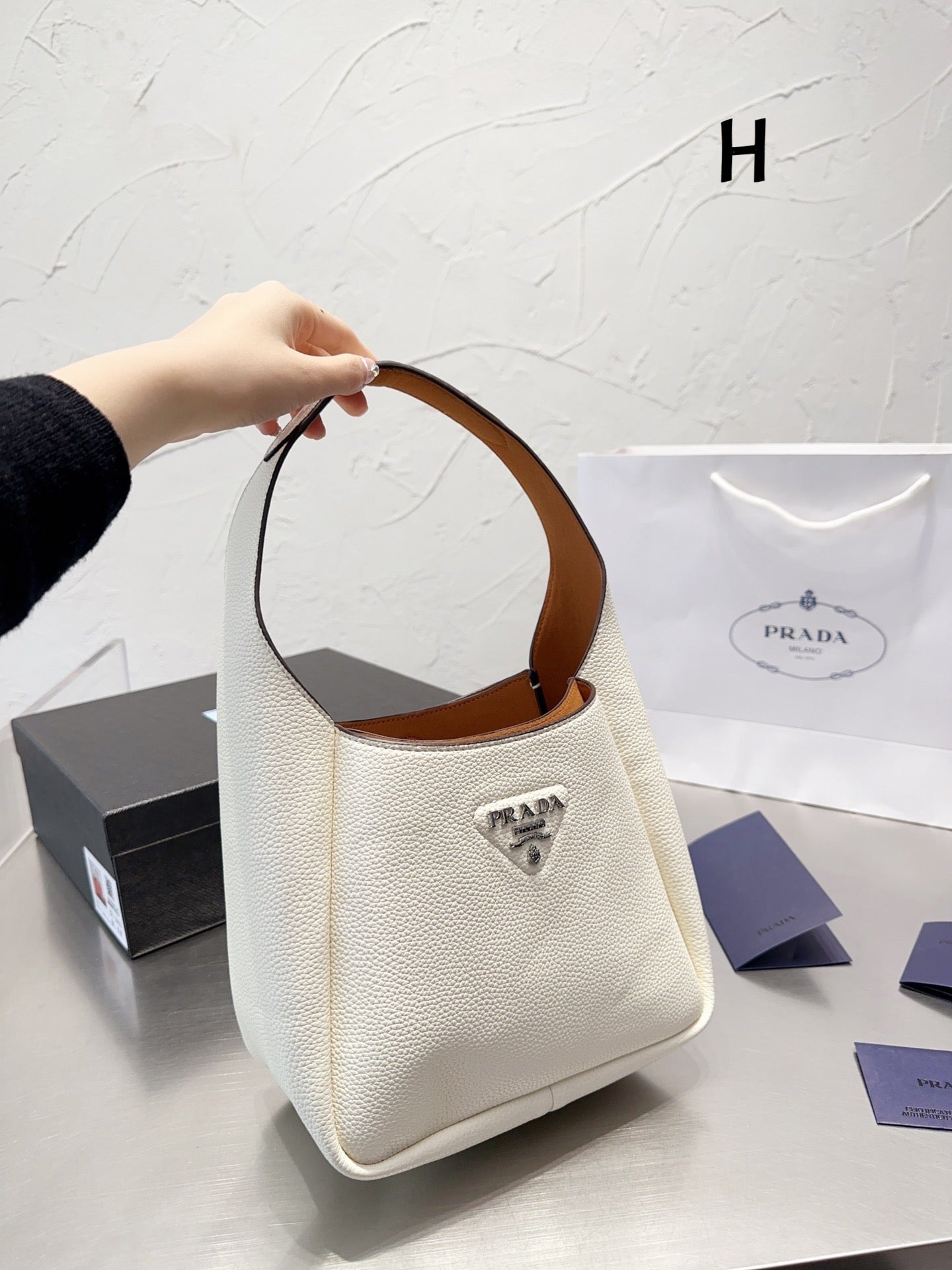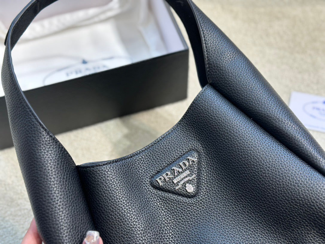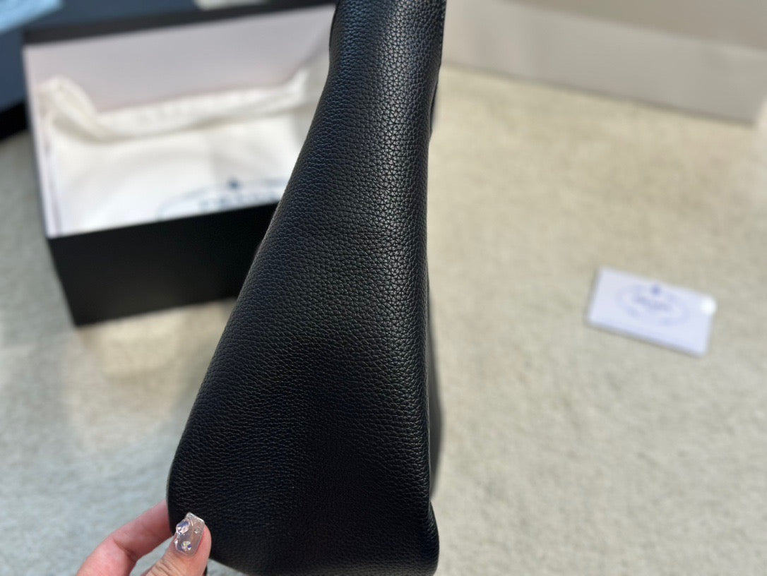 This soft leather tote introduced for the Fall Winter 2020 collection presents a new interpretation of the triangle logo, traced by stitching with the Prada metal lettering logo illuminating its center. The reverse stitching emphasizes the soft, rounded silhouette that comes with a double leather handle and magnetic button closure. The nappa interior has three compartments.