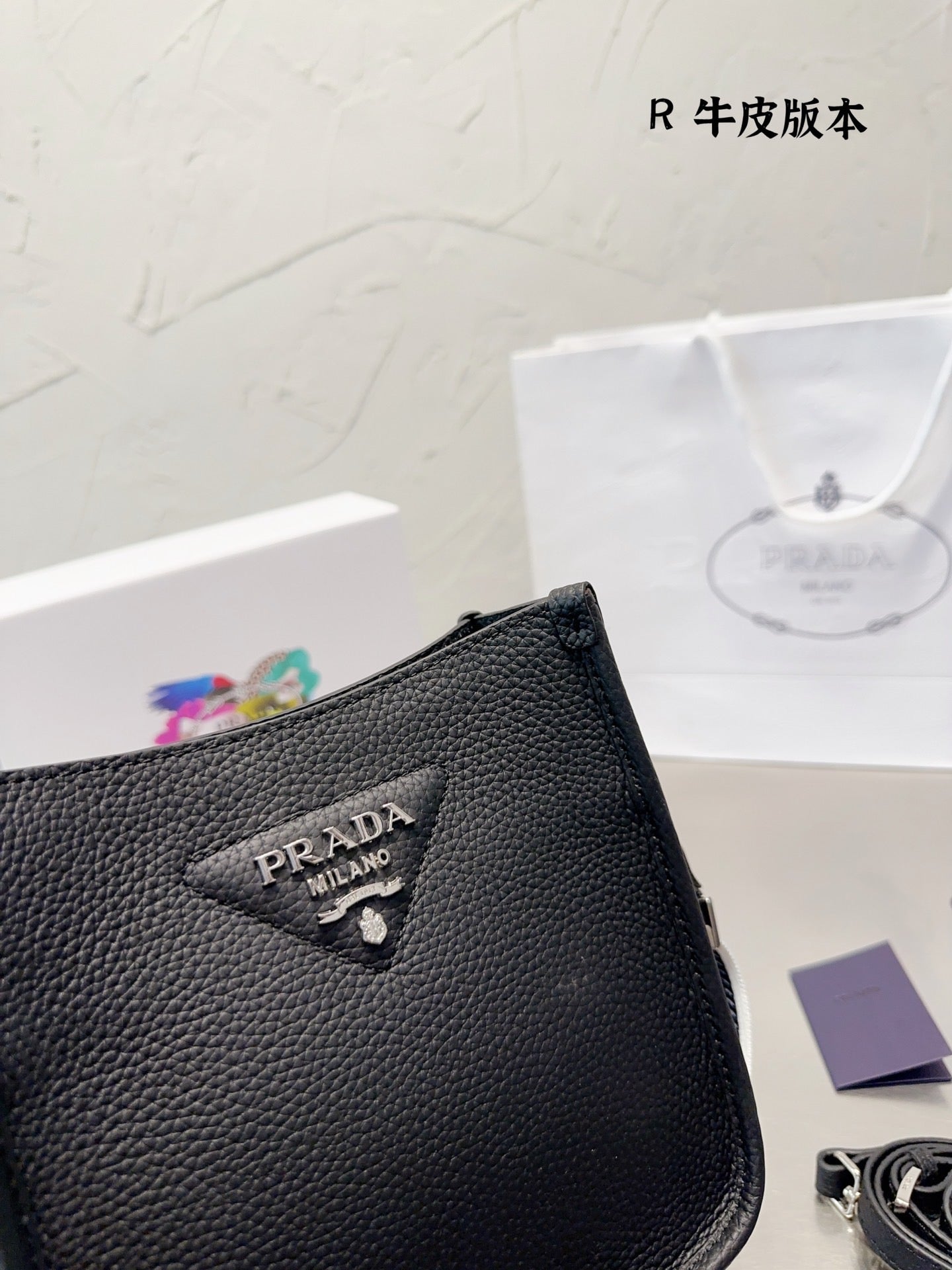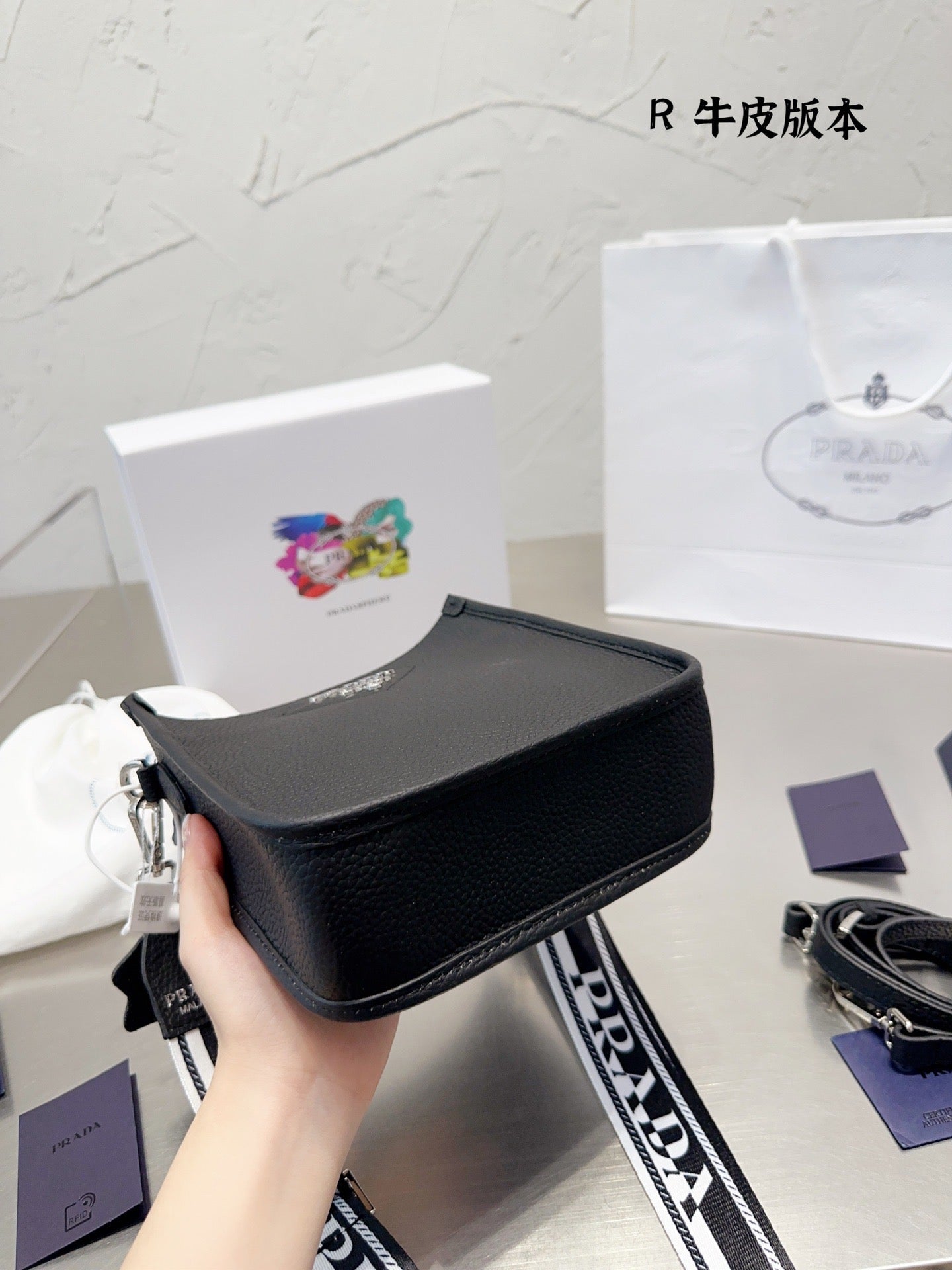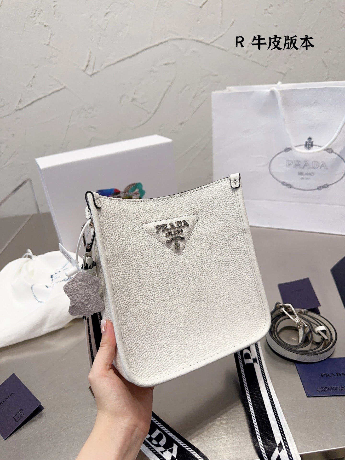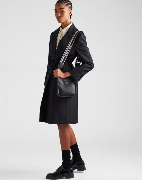 The sleek design of this leather mini shoulder bag is emphasized on the front by the metal triangle logo that adds an iconic note. The detachable logo-print woven tape shoulder strap emphasizes the contemporary character of the accessory.