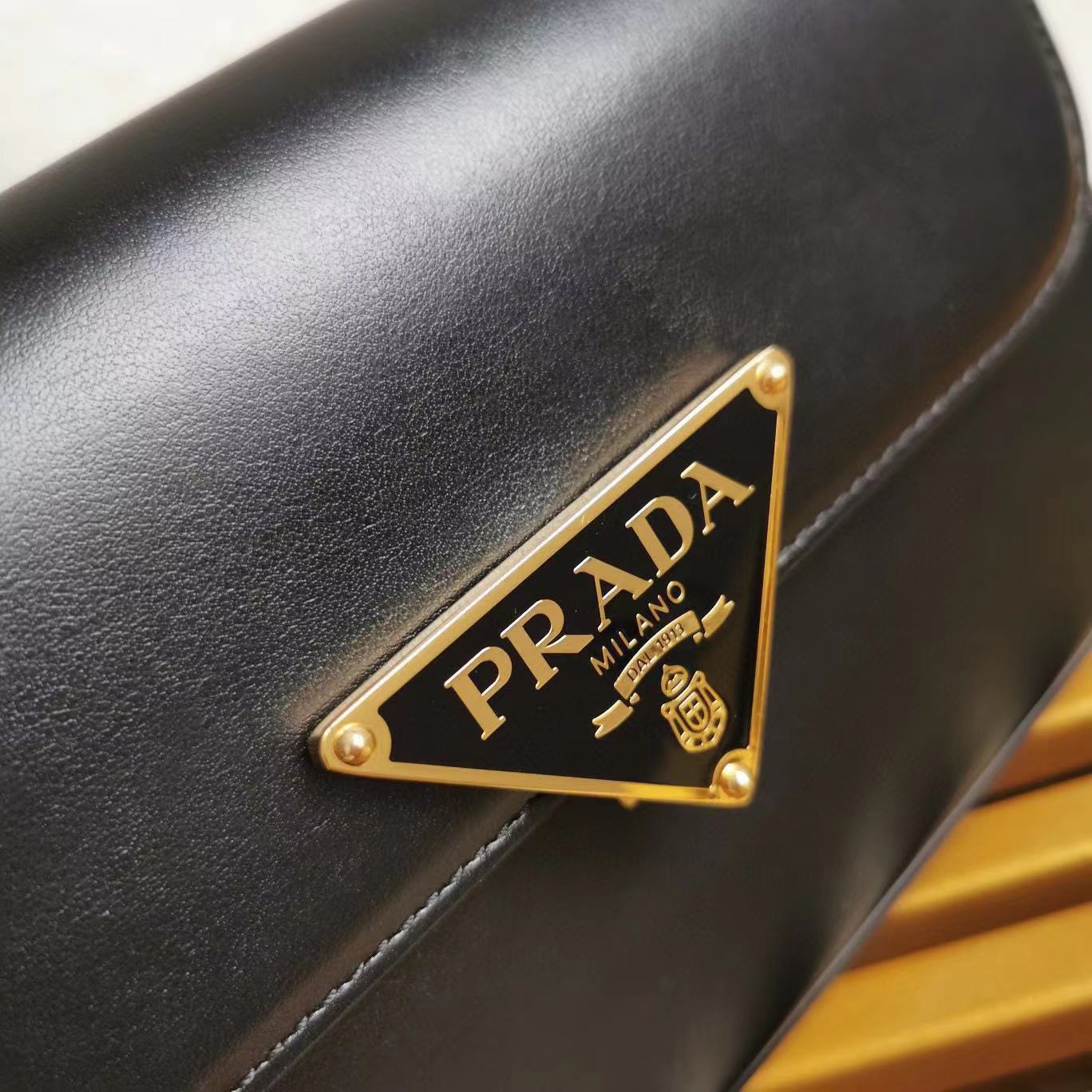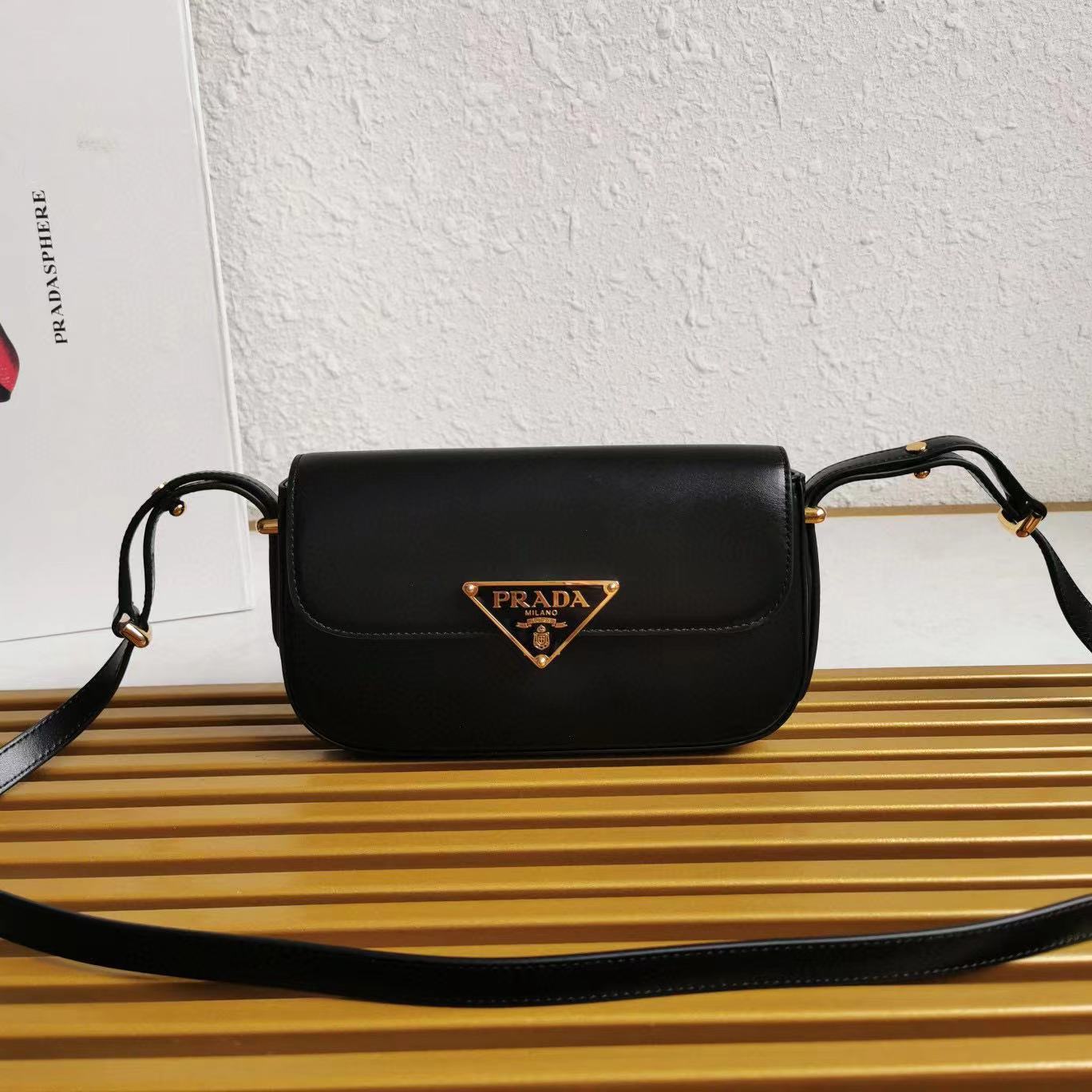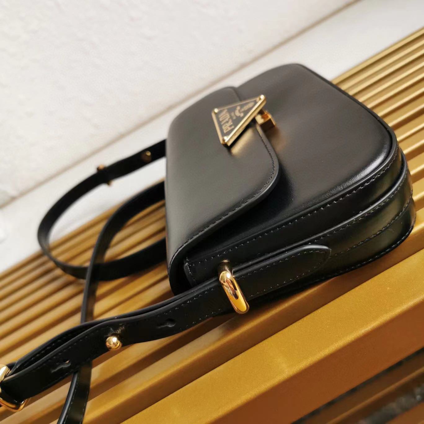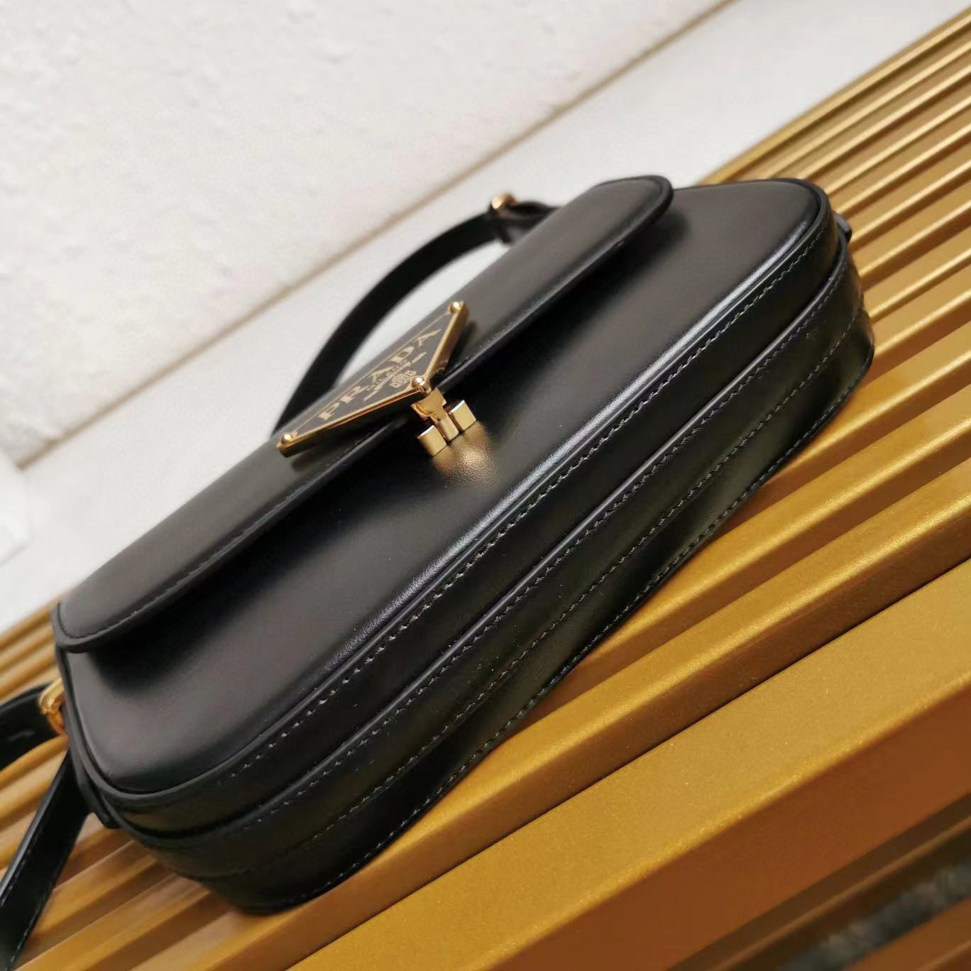 This shoulder bag plays with the concept of simplicity through its lines and compact size, combining versatility and elegance in a refined design. The leather accessory comes with an adjustable shoulder strap and is embellished with metal hardware like the iconic triangle logo that adorns the clasp on the front.