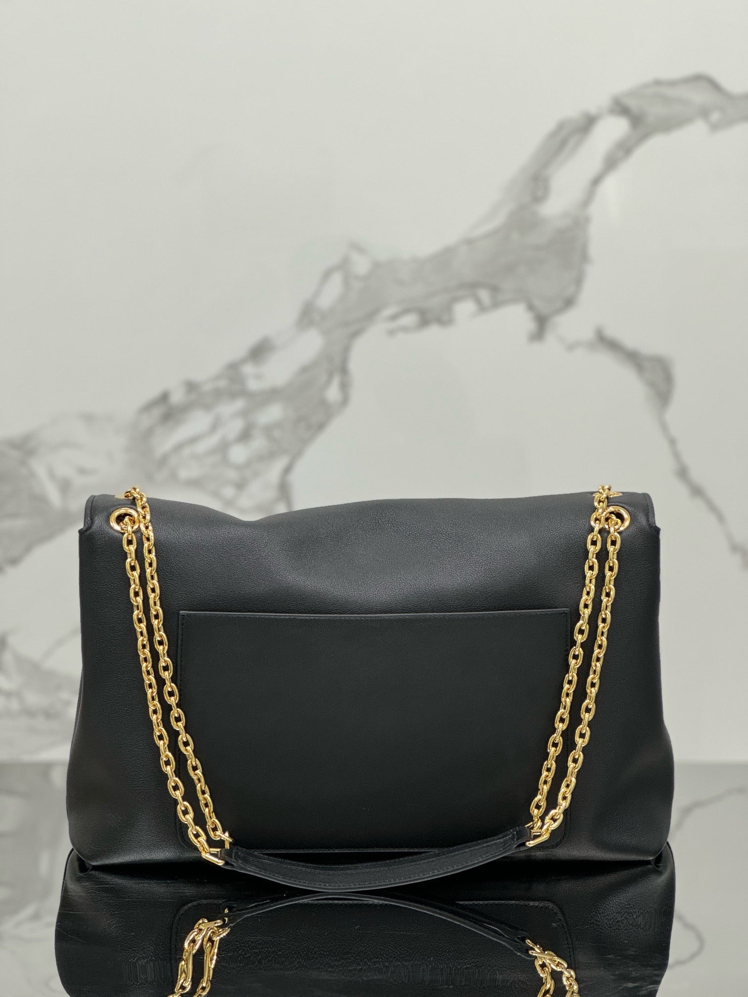 This refined and pragmatic shoulder bag combines details with timeless elegance and a silhouette with contemporary volumes emphasized by the soft touch of leather. The style is characterized by sliding chain handles, a roomy nappa leather interior, and a back pocket. The accessory is accented with shiny metal hardware and decorated with the elegant lettering logo embossed on the flap.