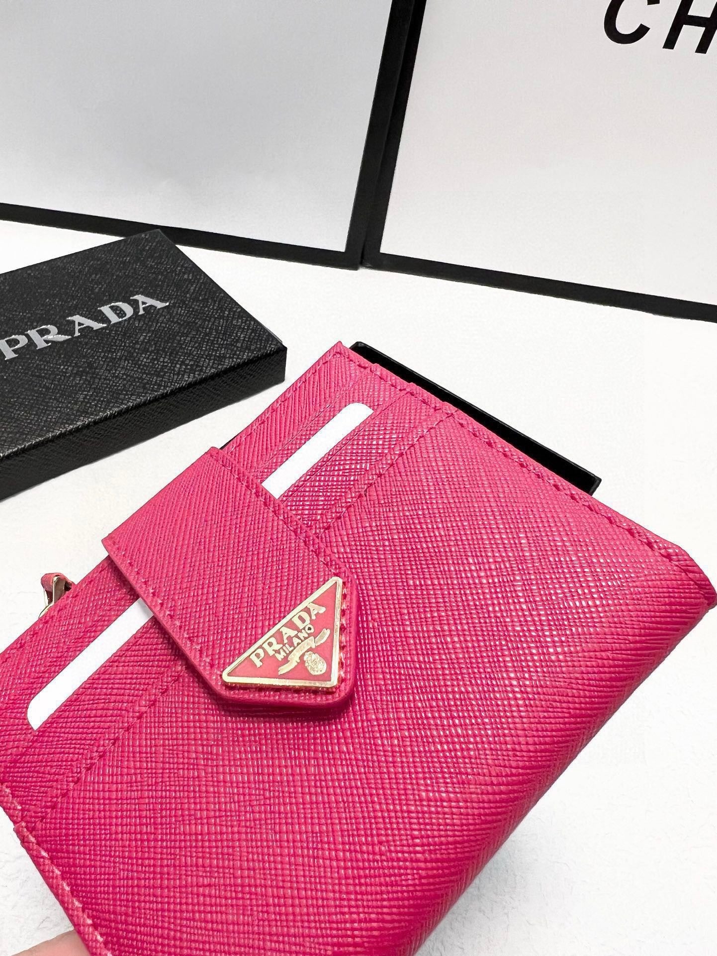 This wallet with external card slots has sophisticated, precious allure. The accessory with minimalist design is accented with the brand's iconic enameled metal triangle logo that embellishes the closure.