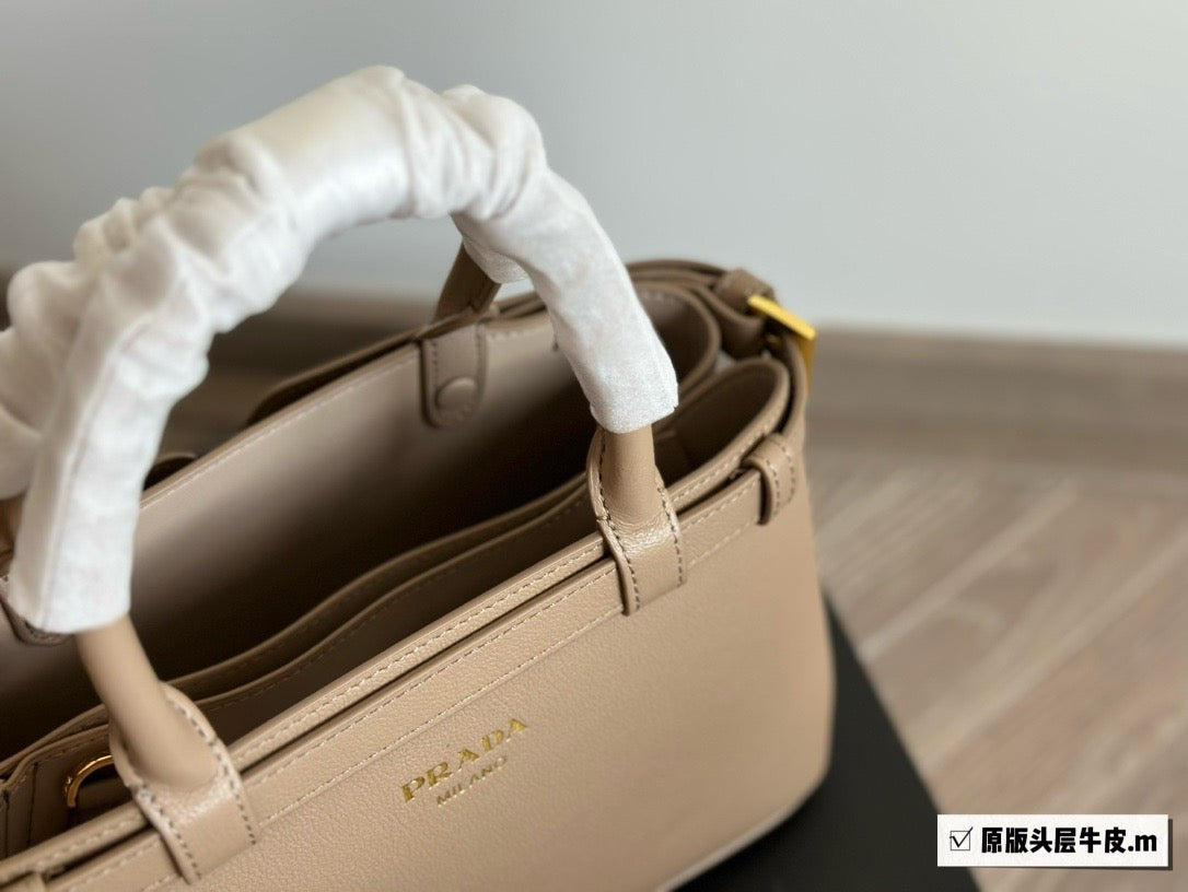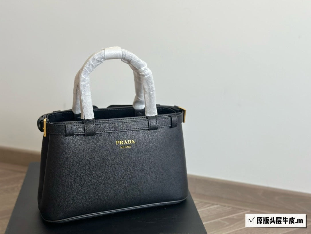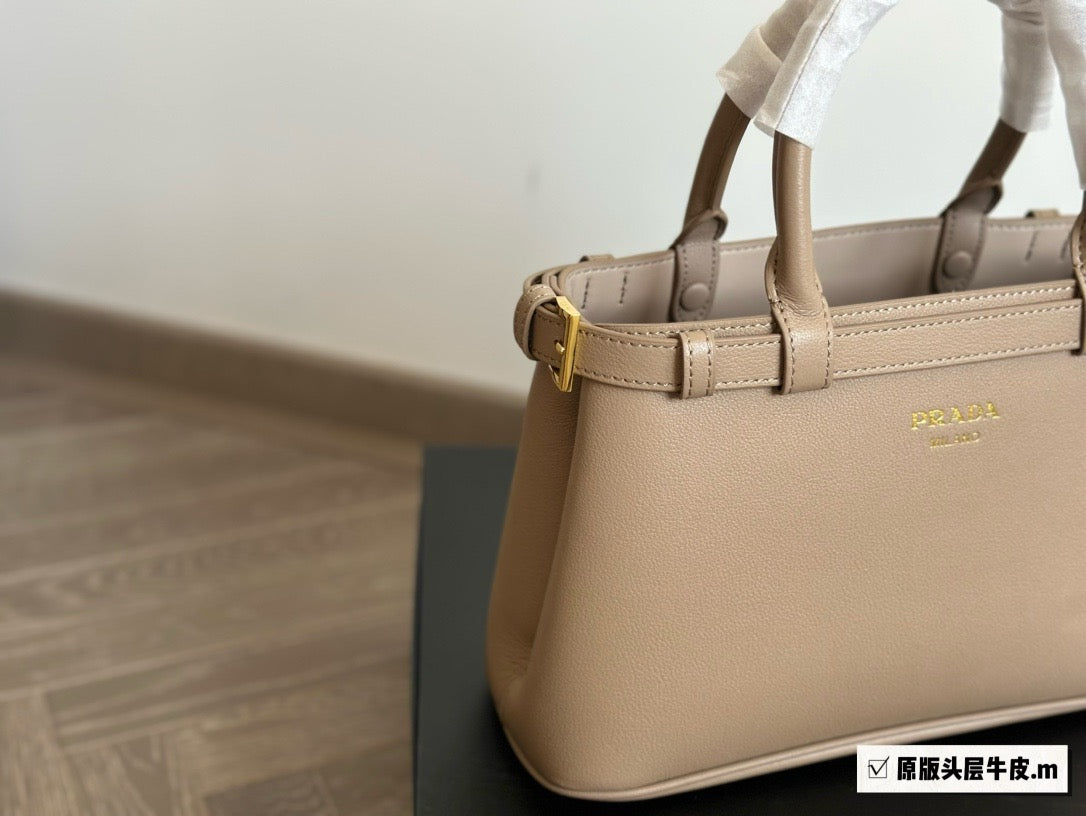 Clean lines and refined elements tell the story of Prada's dual aesthetic that blends simplicity and detail, functionality and elegance. This small leather bag summarizes Prada's stylistic codes in a pragmatic yet sophisticated design, with nappa leather interior characterized by three compartments. The silhouette is animated by the distinctive touch of the leather belts, both refined and modern. The hot-stamped lettering logo in 22 kt gold leaf adds a precious signature to the bag.